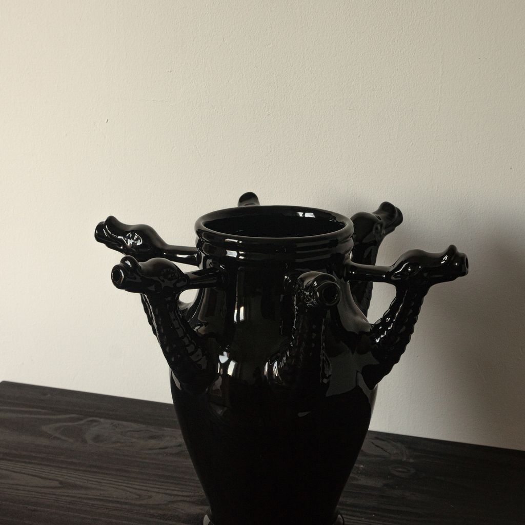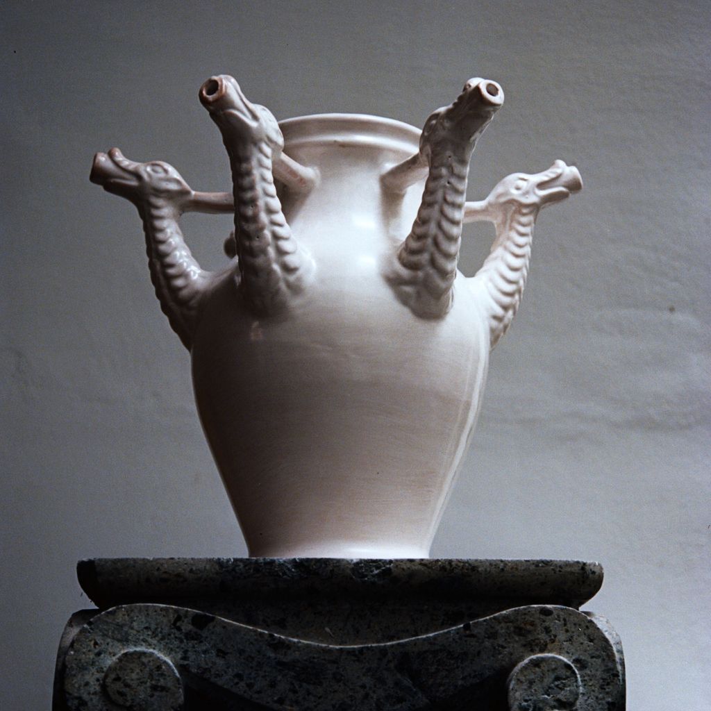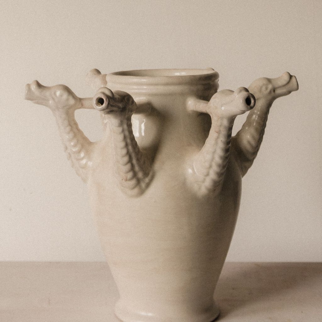 Inspired by the historic Castelli drug pots from the Orsini-Colonna collection, the Drago Vase reimagines the vessels once used by apothecaries to store herbal syrups. This ceramic piece features six hand-sculpted dragon heads, offering a contemporary take on an original pot created for a traditional wedding trousseau. Hand-thrown in terracotta and finished with a lead-free glaze, the vase highlights the beauty of artisanal craftsmanship while giving a modern, sculptural presence to any interior.