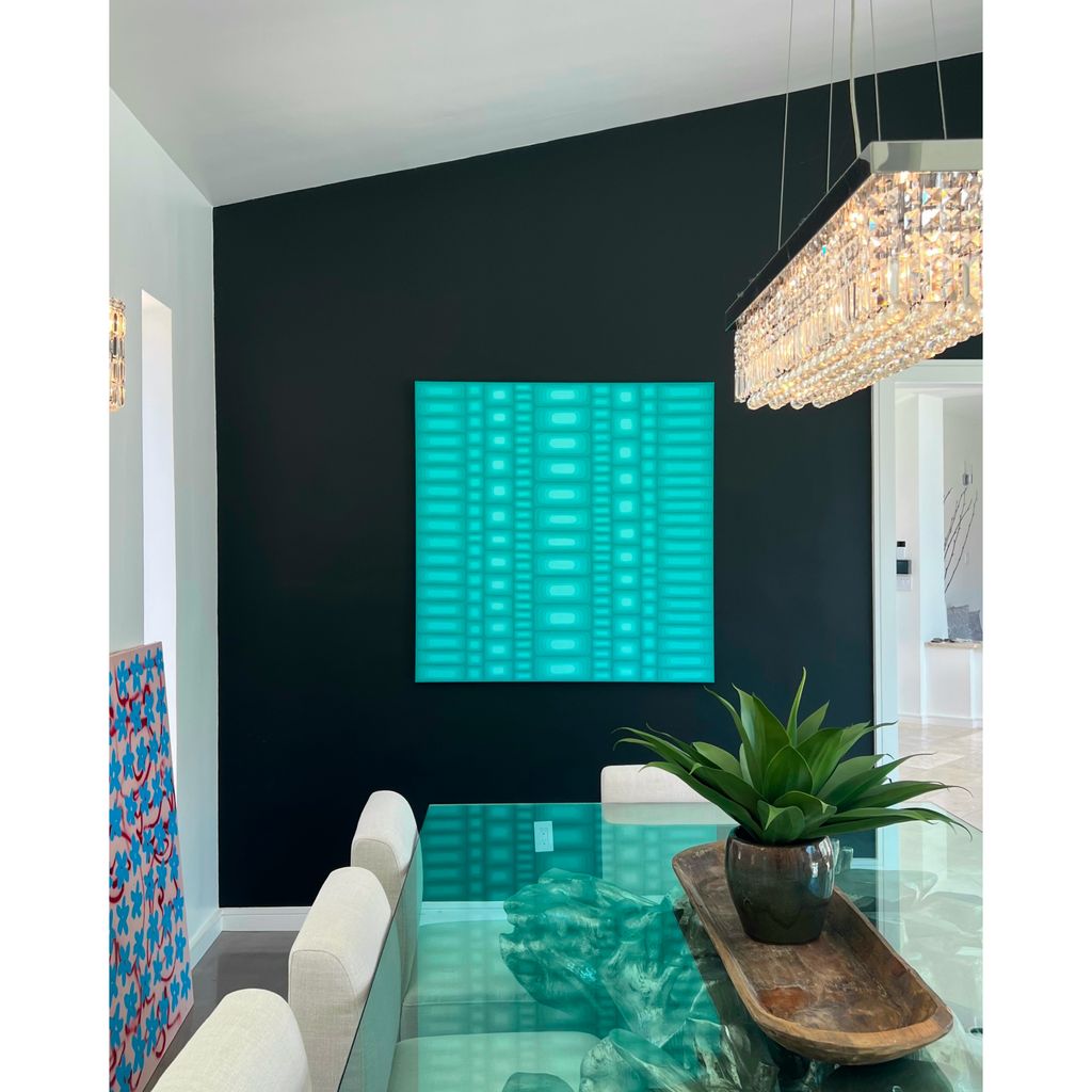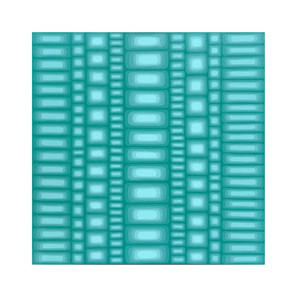 Sophia Croasdale is a large-scale abstract artist based in Austin, TX who earned her BFA from Cal Poly, San Luis Obispo. Her work is rooted in pattern painting, exploring the interplay of light, illusion, and color theory to create rhythmic compositions. Deeply influenced by architecture, Sophia draws inspiration from the structured repetition found in building materials, tiles, and windows, as well as the organic patterns of nature— such as seashells and water reflections. She considers both the visual rhythm and emotional resonance of color and form, using vibrant hues, gradients, and dynamic patterns to create a balance between harmony and chaos. Her current body of work centers on echoes—forms that resemble ripples or sound waves, each shape reverberating from the one before it. The gradient transitions within these forms enhance the sense of movement, evoking the lingering presence of sound or memory.