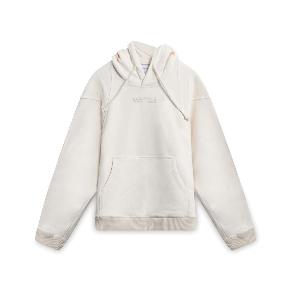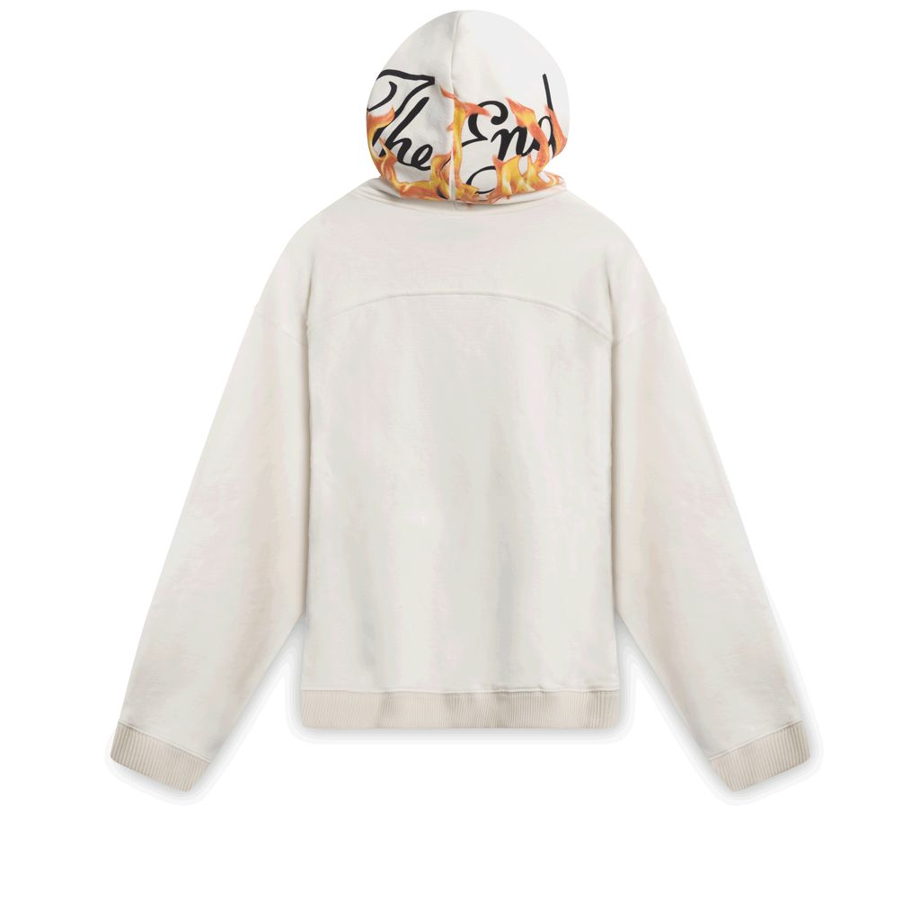 Matching Fire with Fire, Lourdes' new "The End" Collection features this cream-colored hoodie with fire surrounding the logo at the hood.
