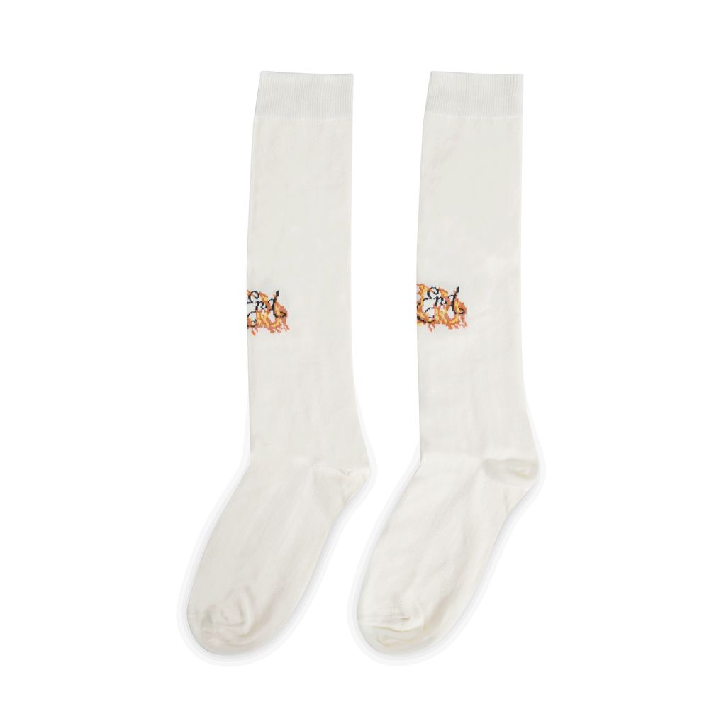 Matching Fire with Fire, Lourdes' new "The End" Collection features these cream-colored socks with fire surrounding the logo.