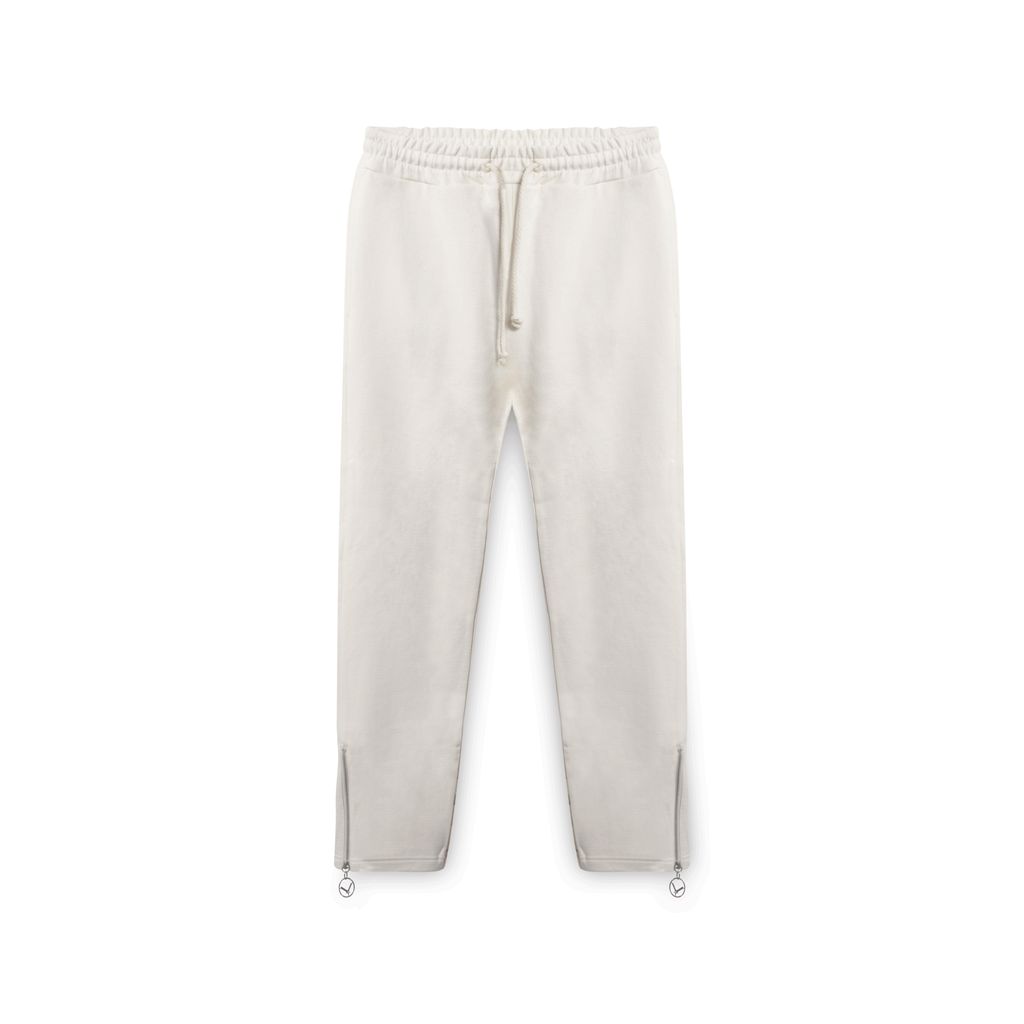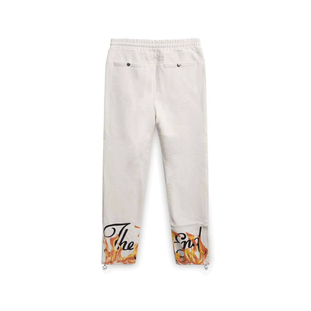 Matching Fire with Fire, Lourdes' new "The End" Collection features this cream-colored sweats with fire surrounding the logo at the ankles.