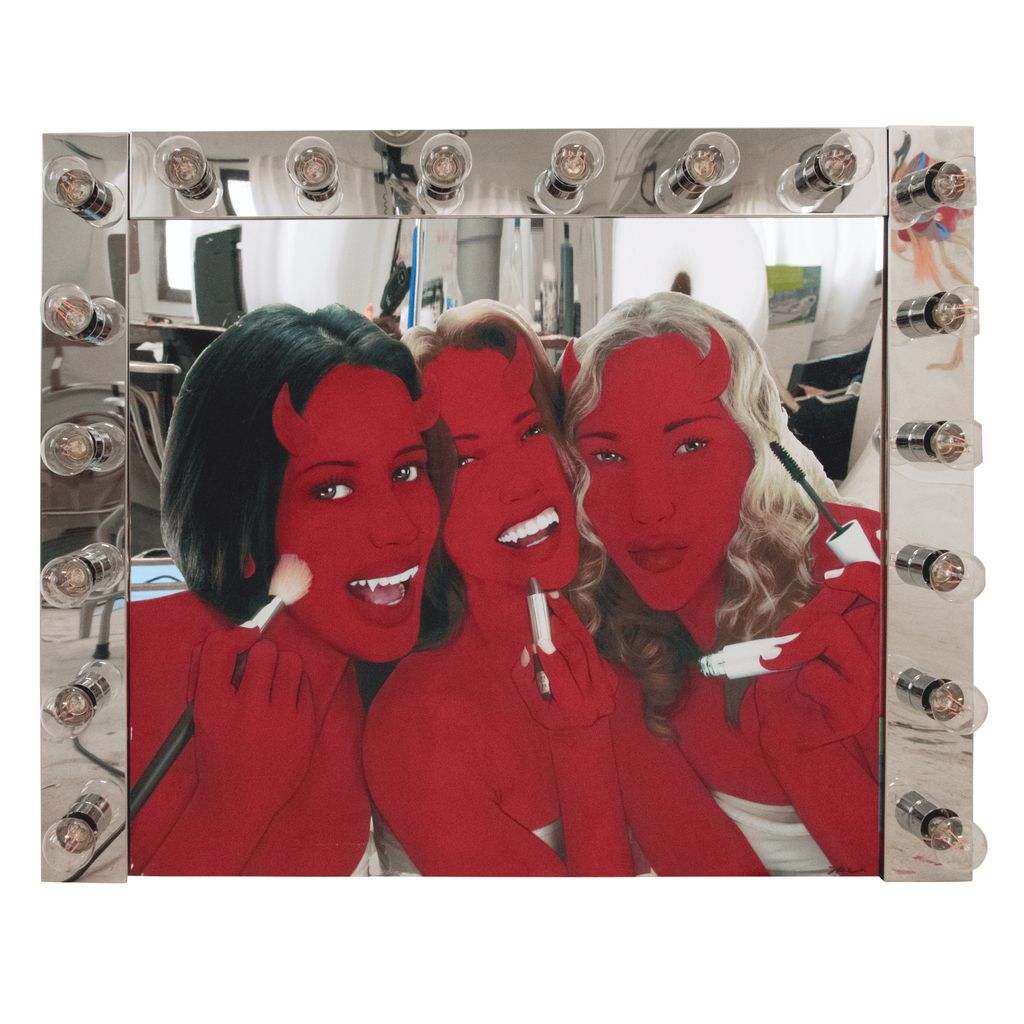 The Face: Vanity 1 features acrylic on mirror, aluminum frame, and 18 light bulbs with red light.