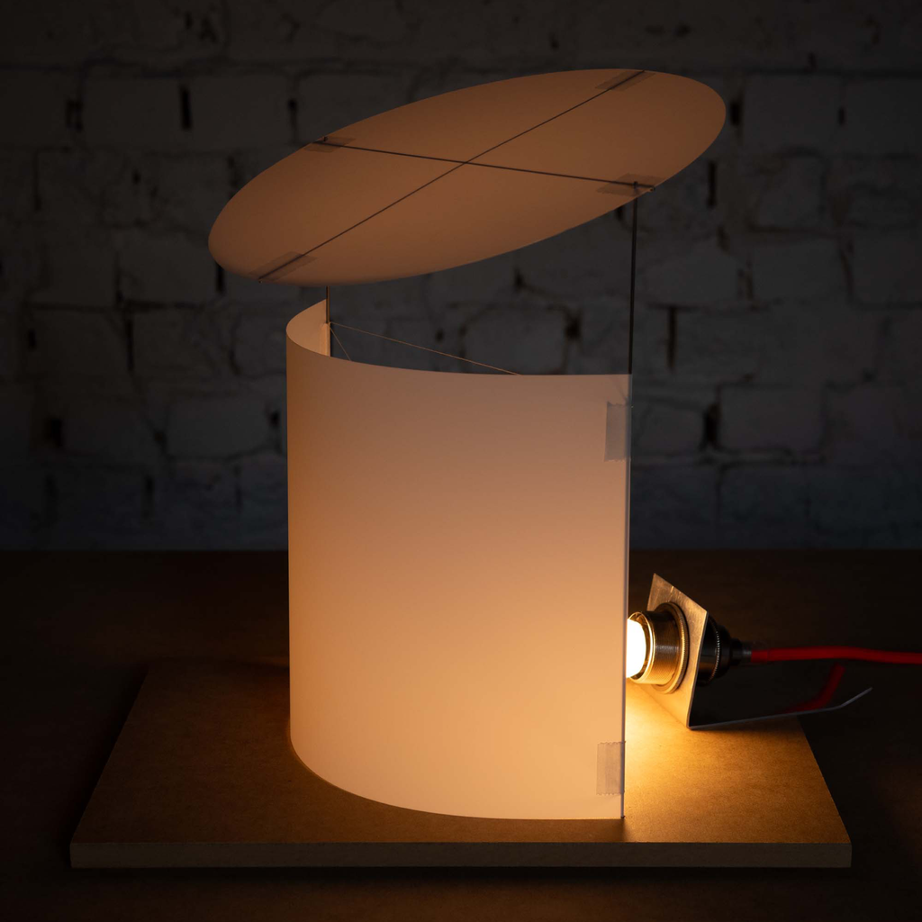 The bracket and shade are offset mounted on an MDF base. Note the light is shipped flat and requires a small amount of assembly.