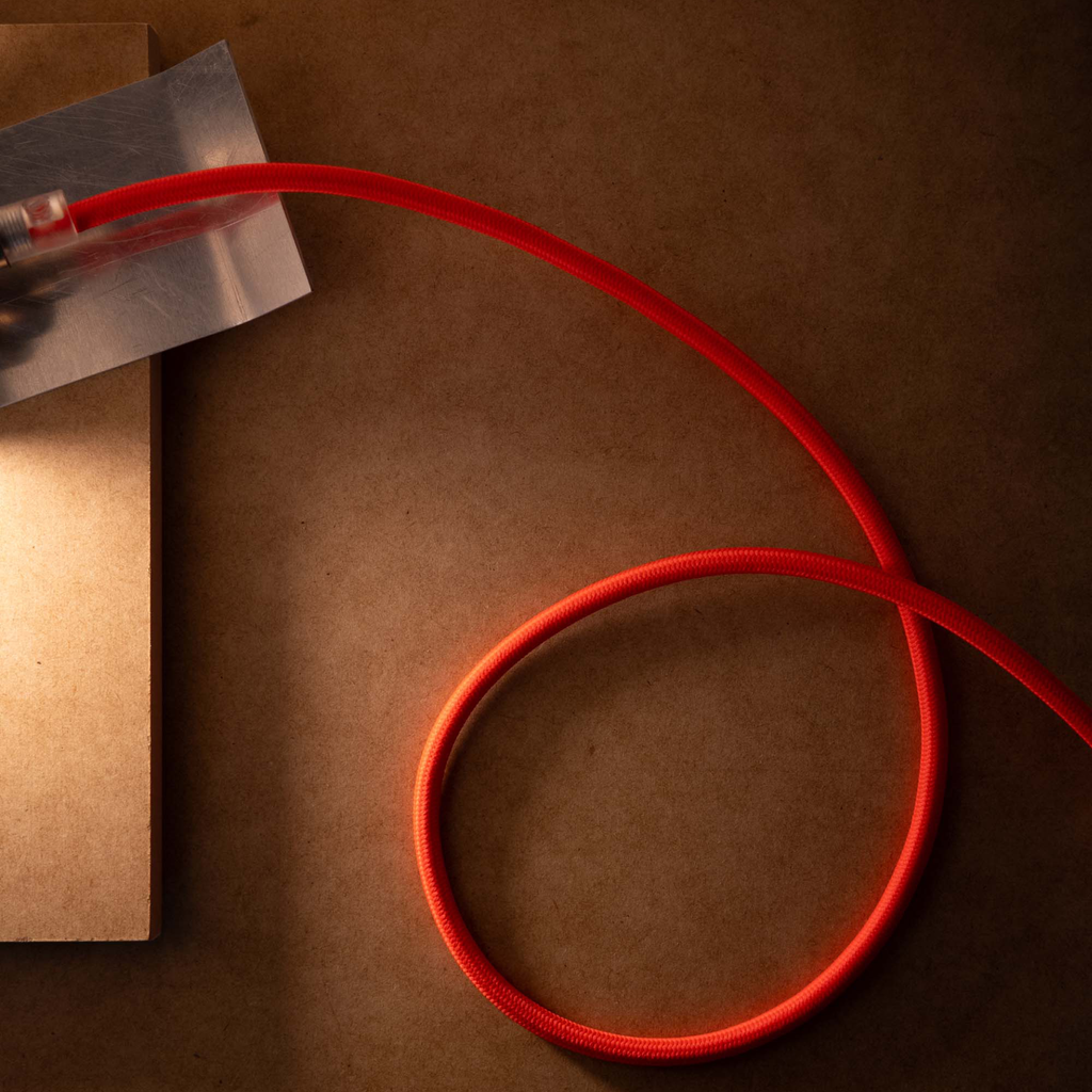1.5m fluorescent orange fabric cord, E27 light fitting, G45 porcelain frosted globe — 2700K 3W 240lm, 240V side entry transparent plug.