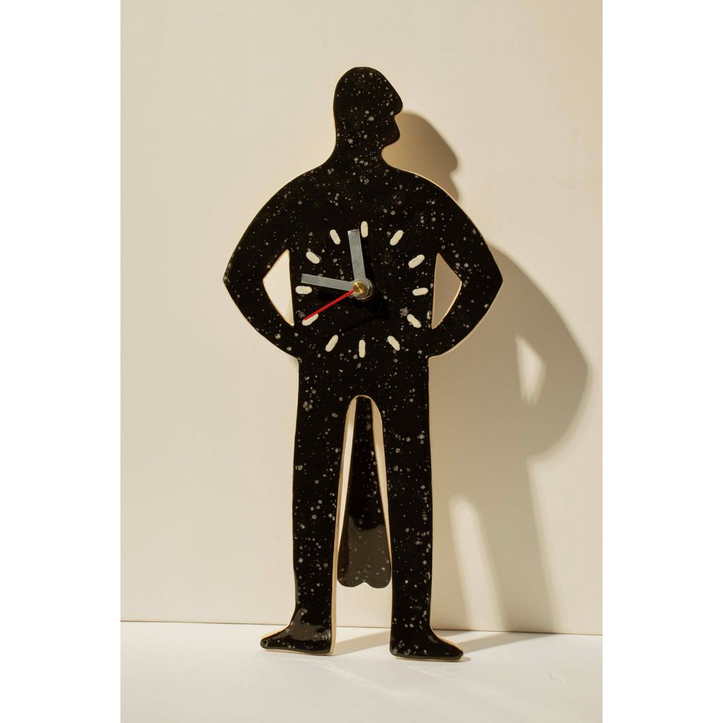 Introducing The Grandfather Clock - a clock that stands tall, confident, and a little bit cheeky! This simple dapper silhouette of a man isn't just here to tell time; he's here to amuse and entertain. Suspended between his legs, you'll find a pair of you know what's, playfully swaying to and fro with each tick and tock. This clock is a unique and lighthearted addition to any room, reminding you that even the most serious of moments can have a touch of whimsy! Do you have the balls to mount him on your wall?