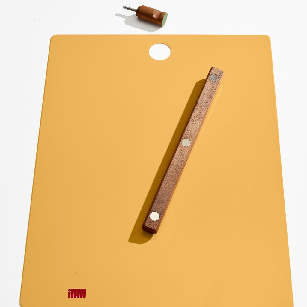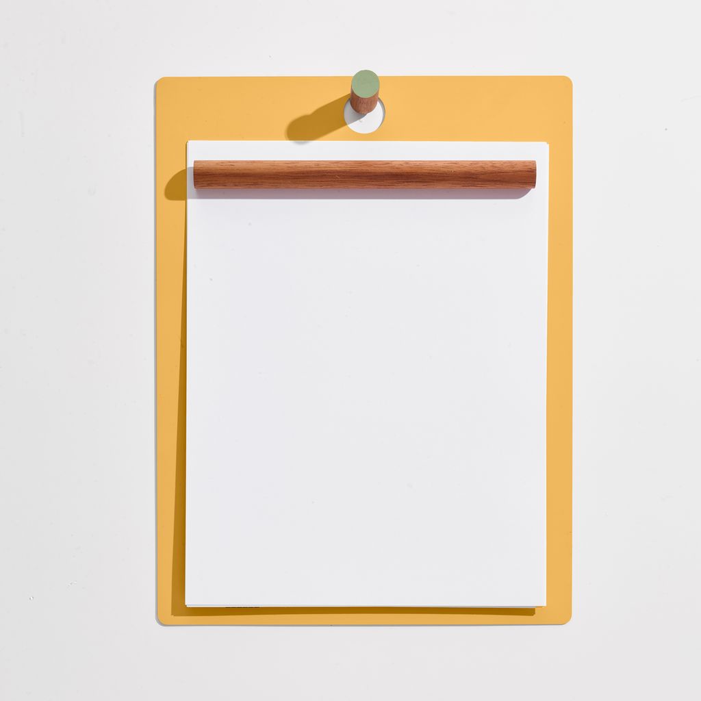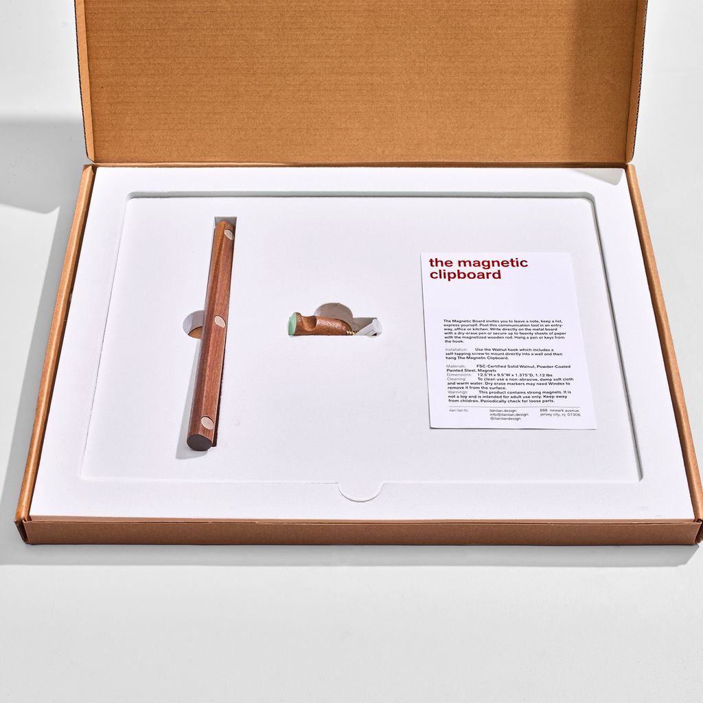 The Magnetic Clipboard invites you to leave a note, keep a list, express yourself. Post this communication tool in an entryway, office or kitchen. Write directly on the metal board with a dry-erase pen or secure up to twenty sheets of paper with the magnetized wooden rod. Hang a pen or keys from the hook. In solid walnut and powder-coated metal.