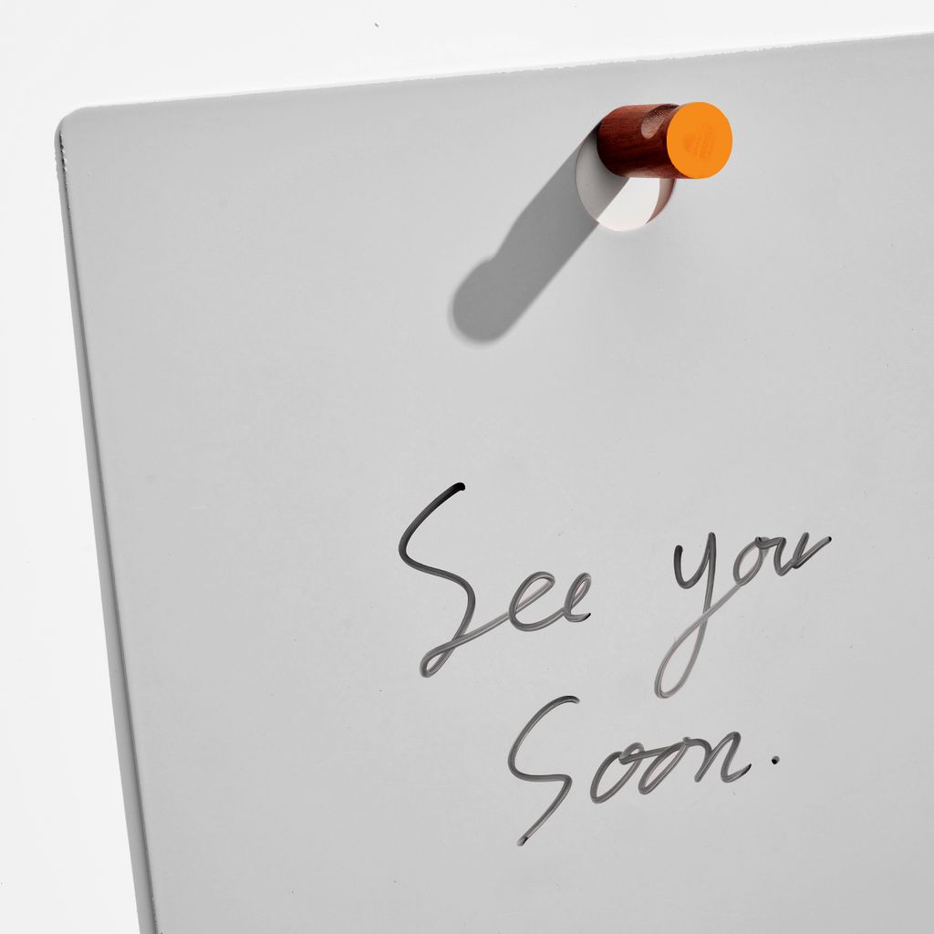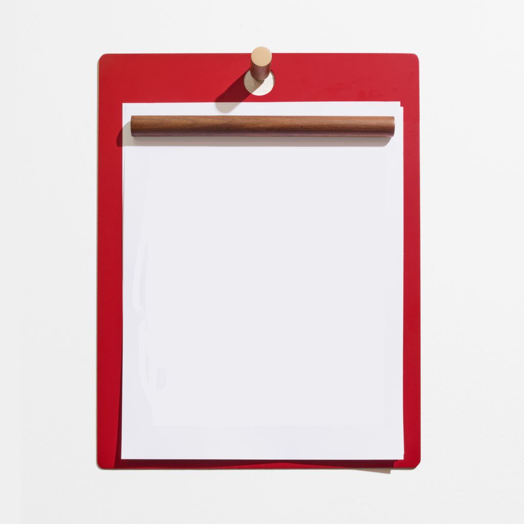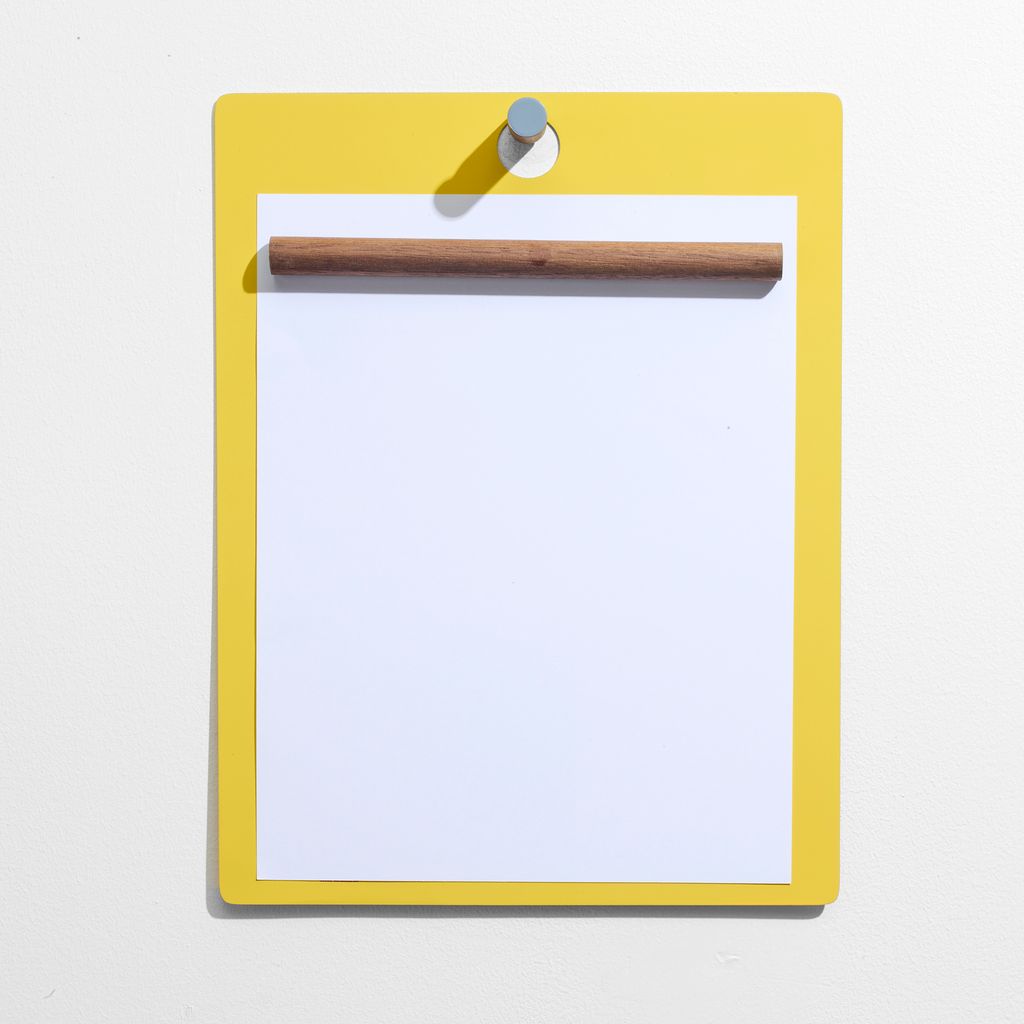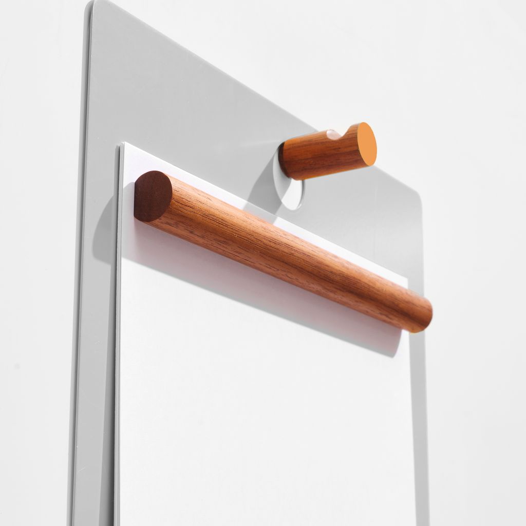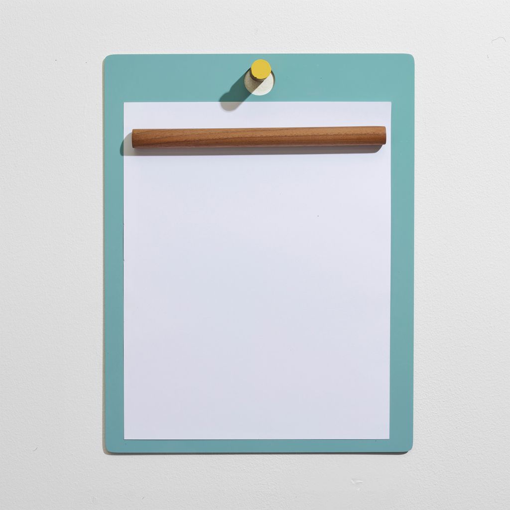 The Magnetic Clipboard invites you to leave a note, keep a list, express yourself. Post this communication tool in an entryway, office or kitchen. Write directly on the metal board with a dry-erase pen or secure up to twenty sheets of paper with the magnetized wooden rod. Hang a pen or keys from the hook. In solid walnut and powder-coated metal.