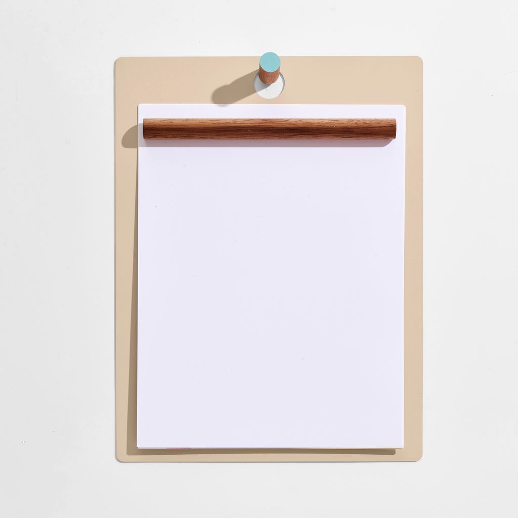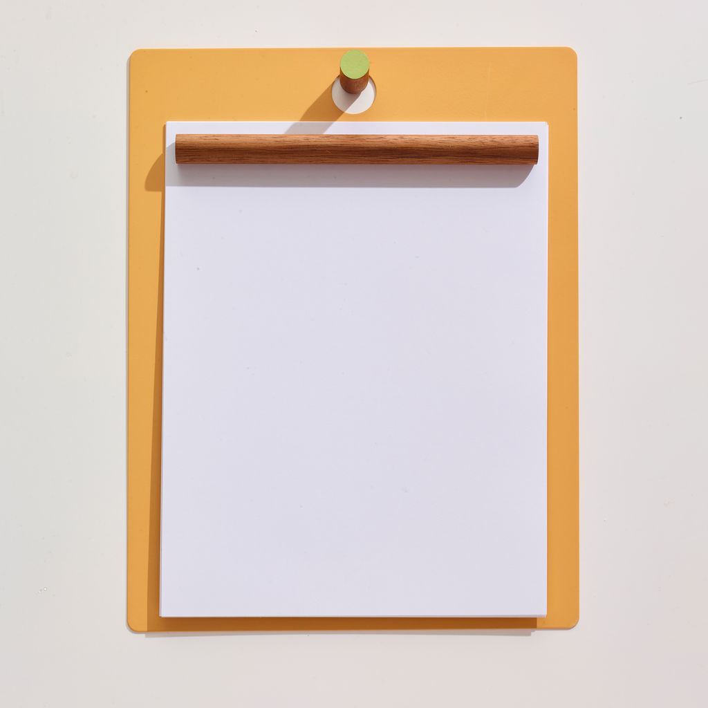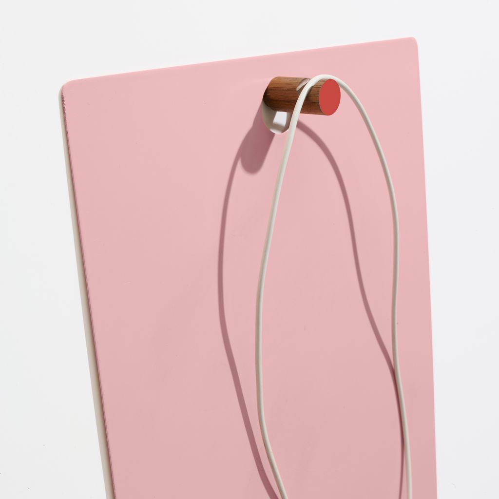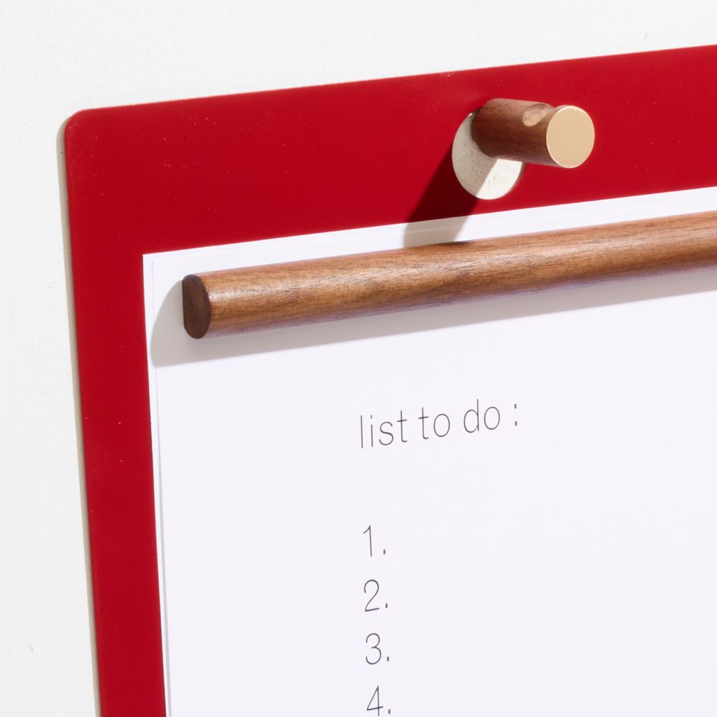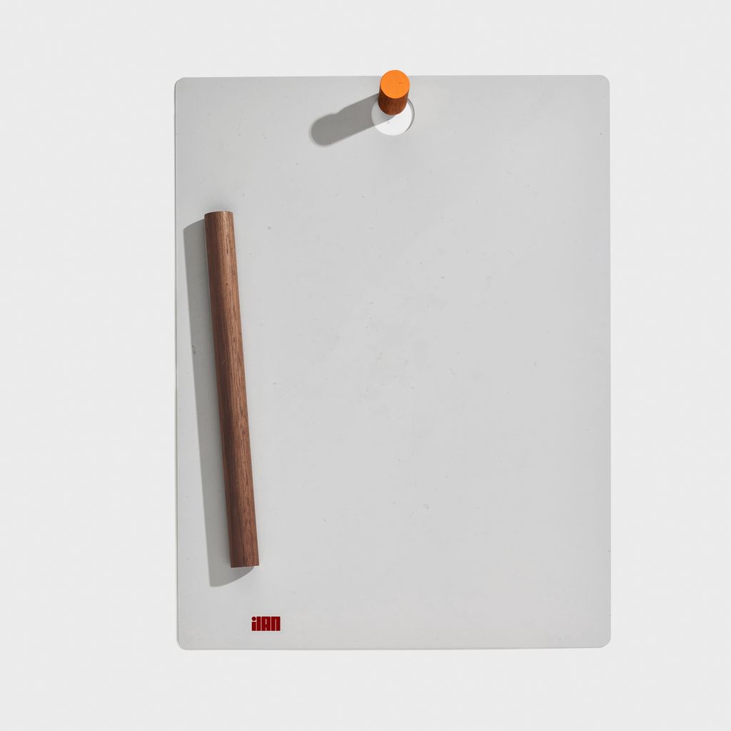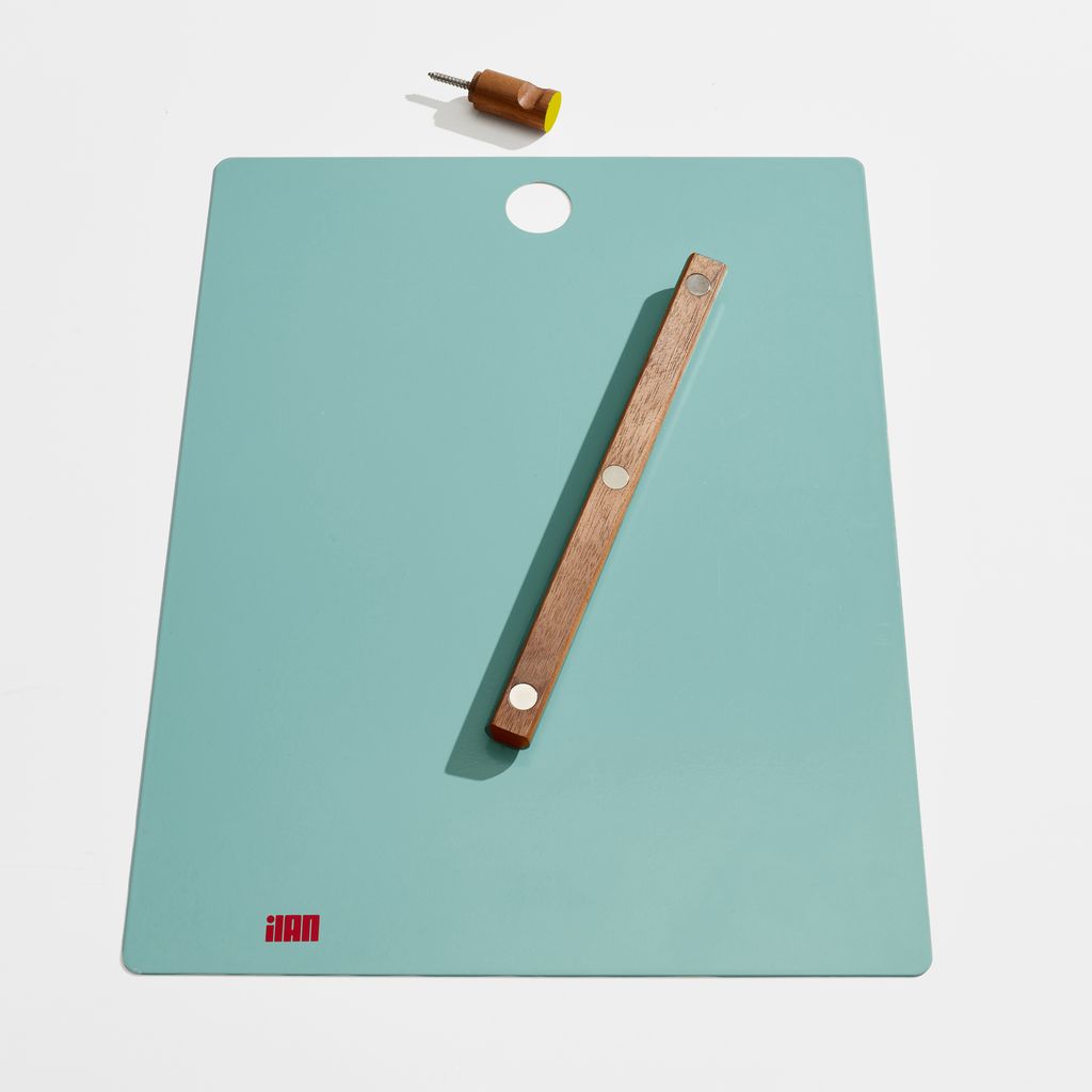 The Magnetic Clipboard invites you to leave a note, keep a list, express yourself. Post this communication tool in an entryway, office or kitchen. Write directly on the metal board with a dry-erase pen or secure up to twenty sheets of paper with the magnetized wooden rod. Hang a pen or keys from the hook. In solid walnut and powder-coated metal.