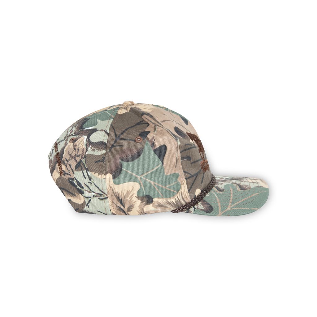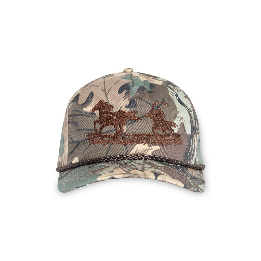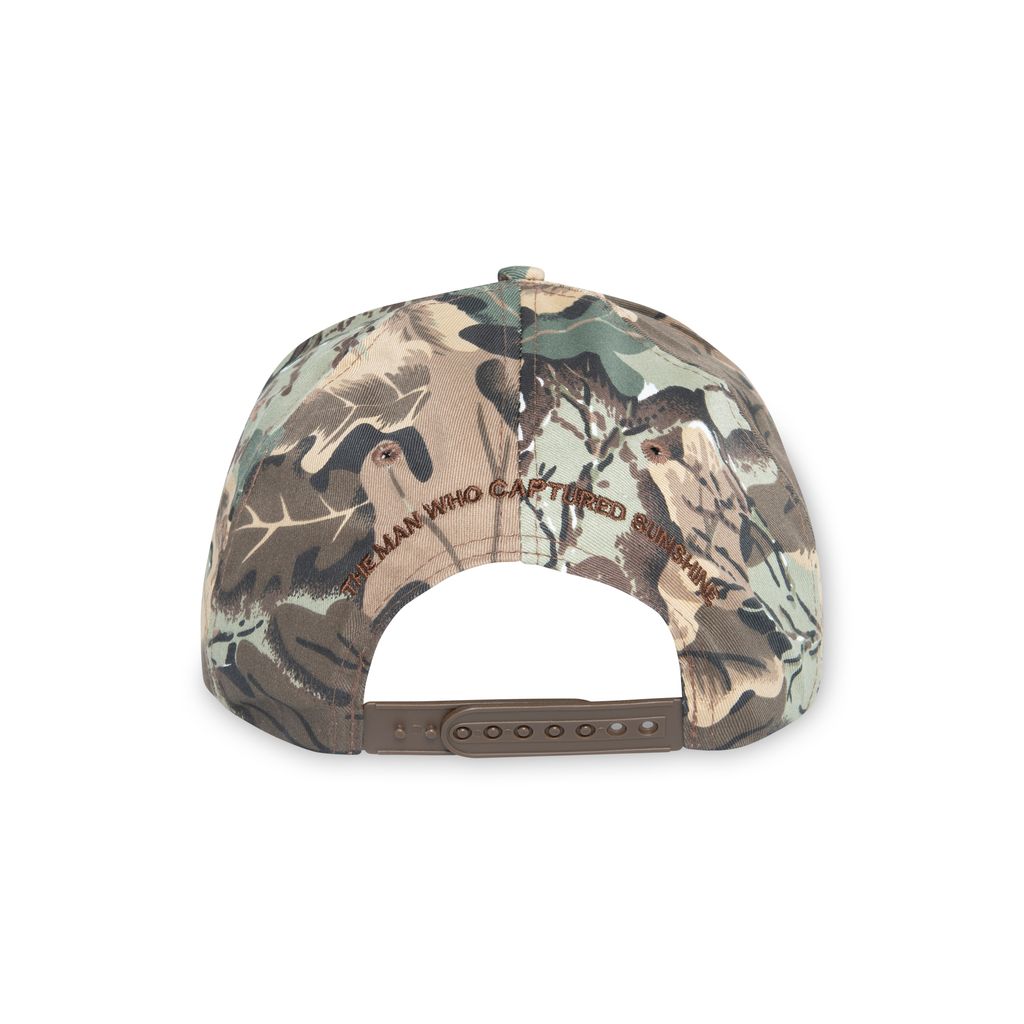 The Man Who Captured Sunshine roping cattle camouflage hat features embroidery detail at front and back, and adjustable snaps at back.