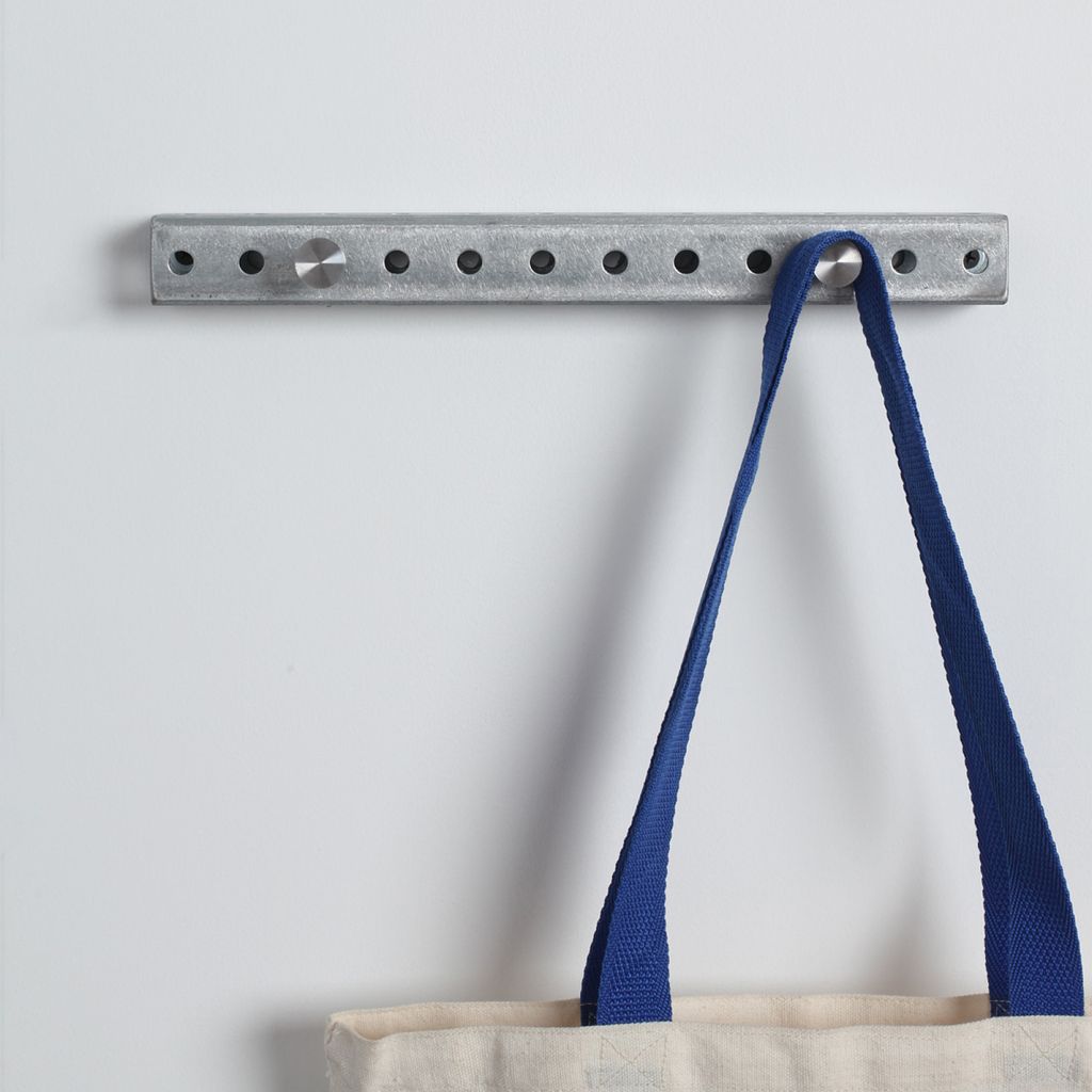 The Mini Utility Rack is made for hanging keys, jackets, totes, tennis rackets, etc. It is a 12" galvanized steel rack with 2 custom steel hooks. Made in the USA.