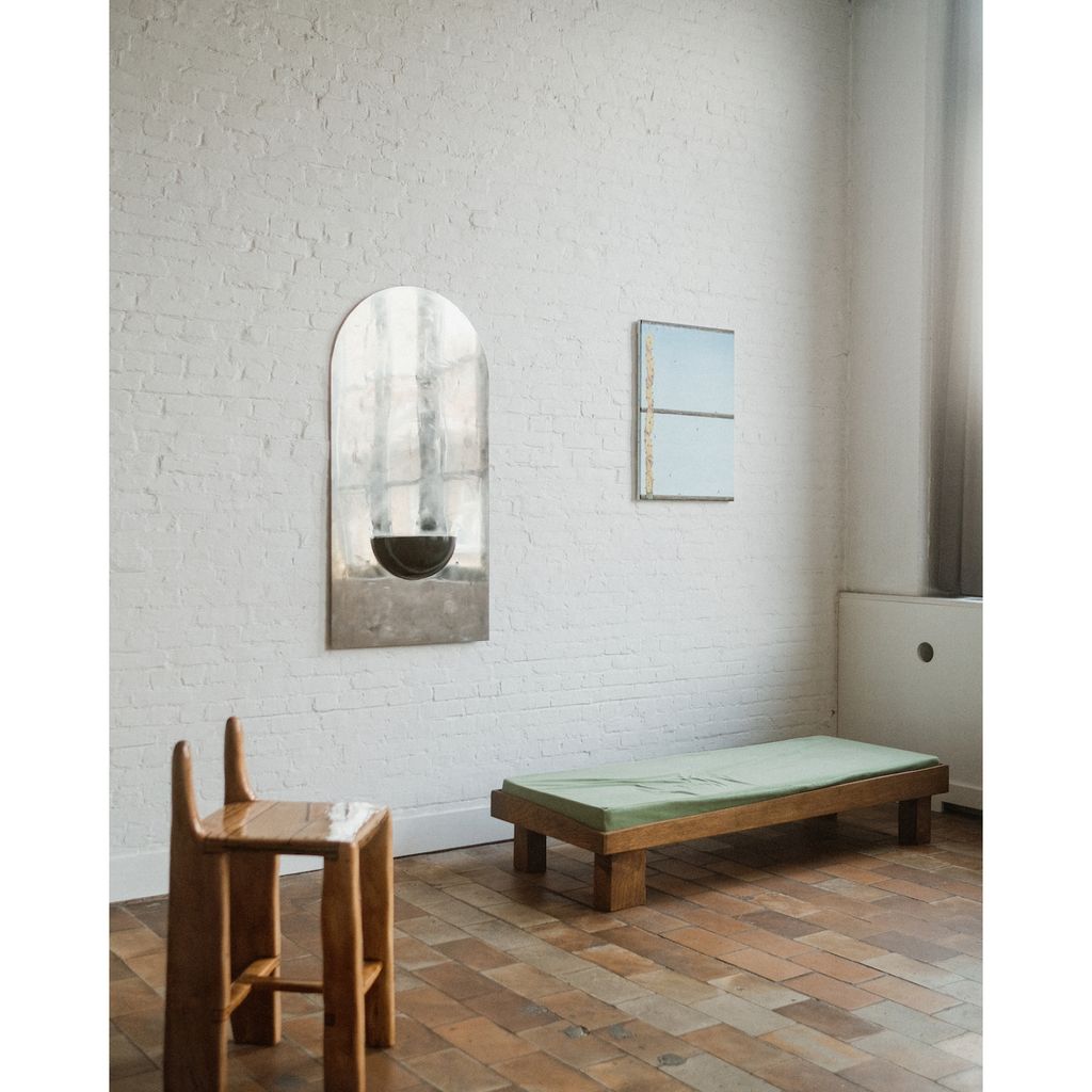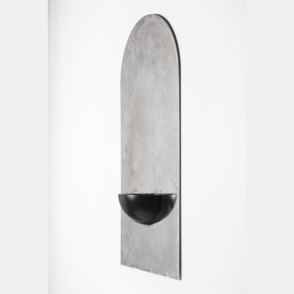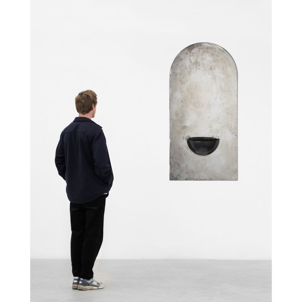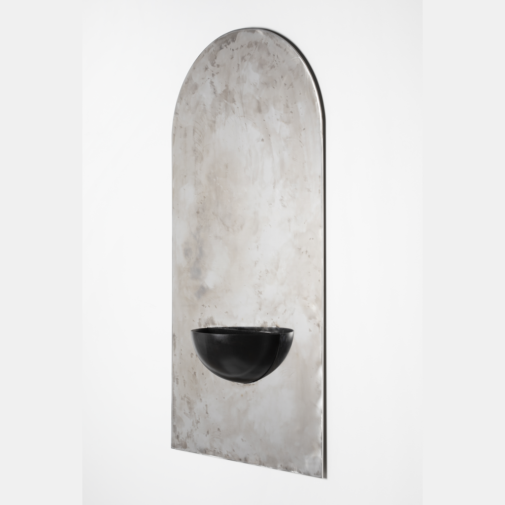 Inspired by medieval stoups traditionally placed at church entrances or beside the Béguines’ beds, the Mirror of Simple Souls combines spiritual symbolism with contemporary design. Its hand-brushed stainless steel plate creates a softly blurred, ethereal reflection, while the painted iron half-sphere can function as a small container or remain empty as a contemplative, sculptural vessel.