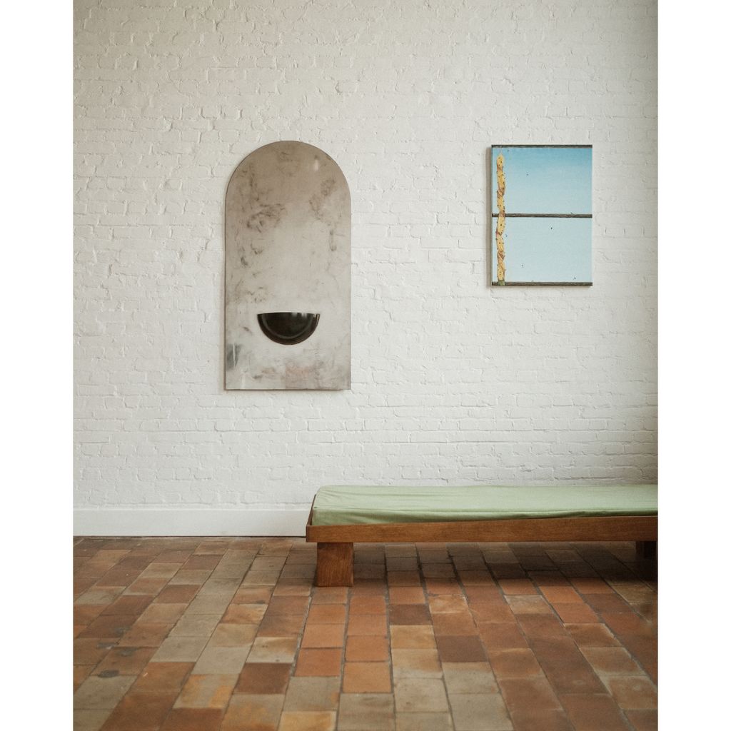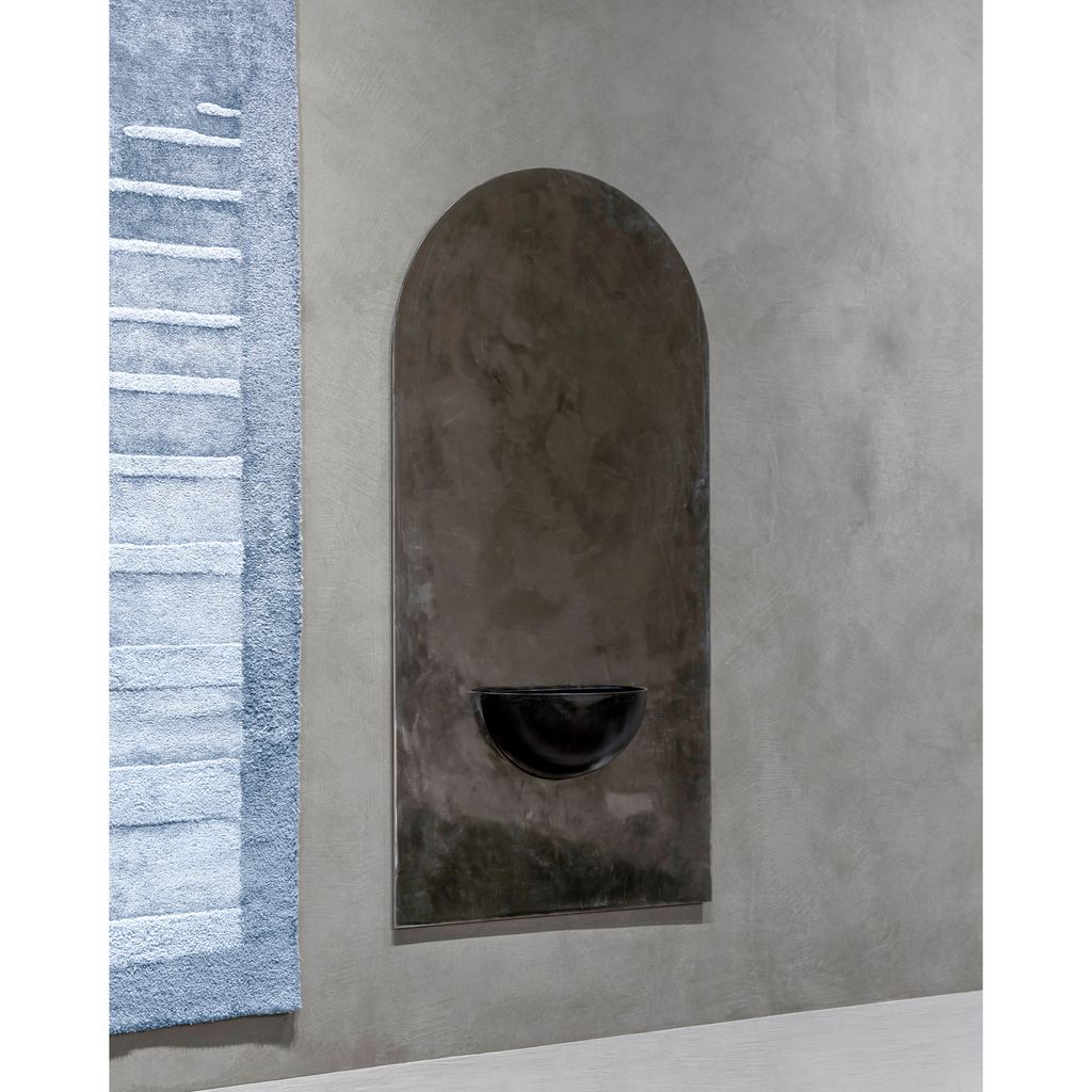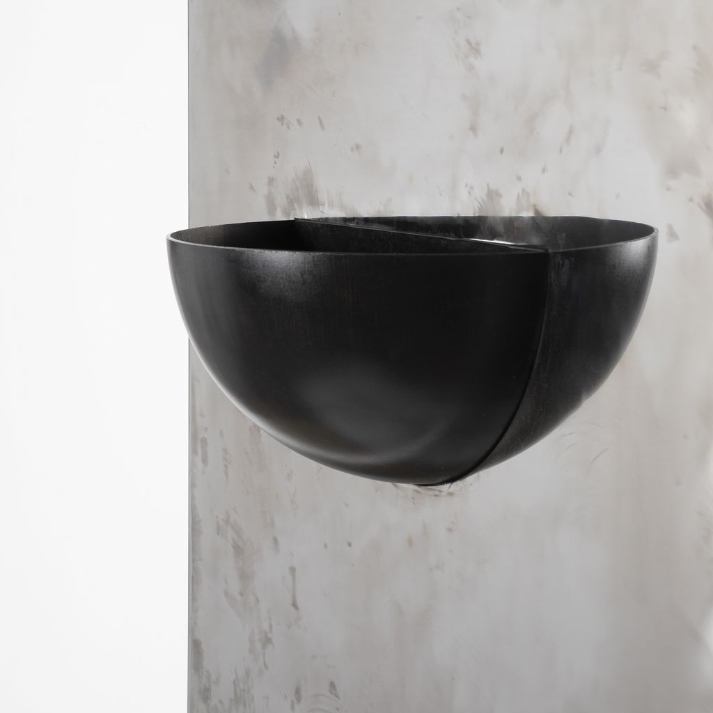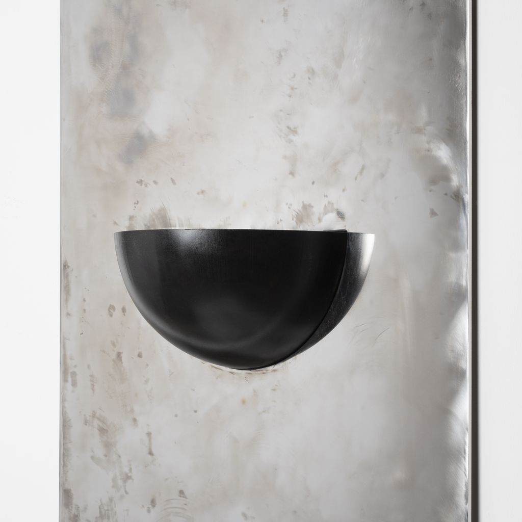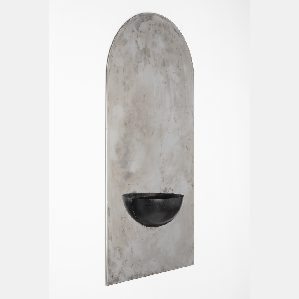 Inspired by medieval stoups traditionally placed at church entrances or beside the Béguines’ beds, the Mirror of Simple Souls combines spiritual symbolism with contemporary design. Its hand-brushed stainless steel plate creates a softly blurred, ethereal reflection, while the painted iron half-sphere can function as a small container or remain empty as a contemplative, sculptural vessel.