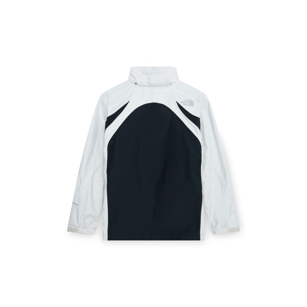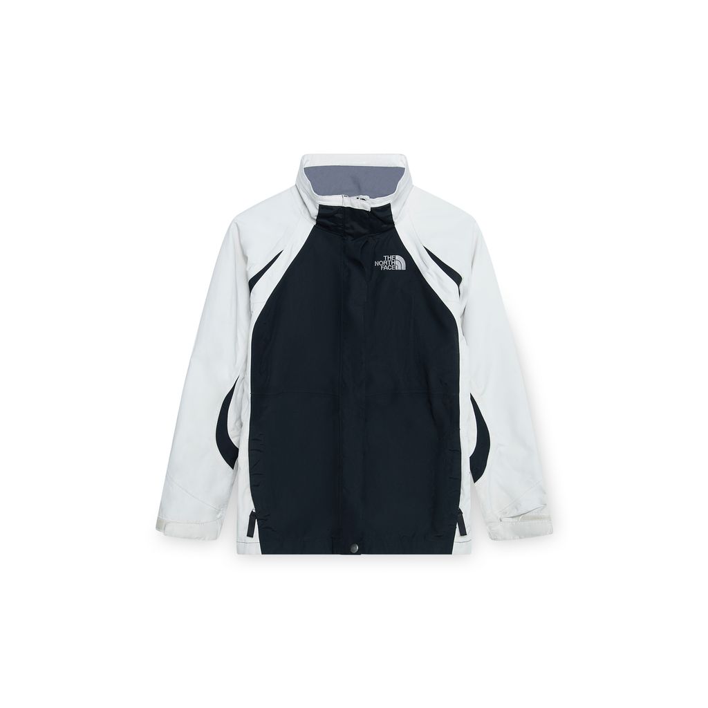 The North Face color block jacket features contrast colors throughout, embroidered logo at chest and back, mock neck, and zipper snaps velcro at front.