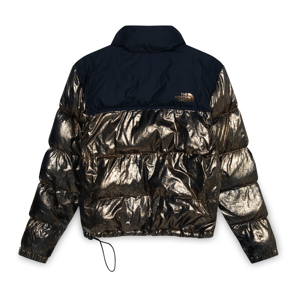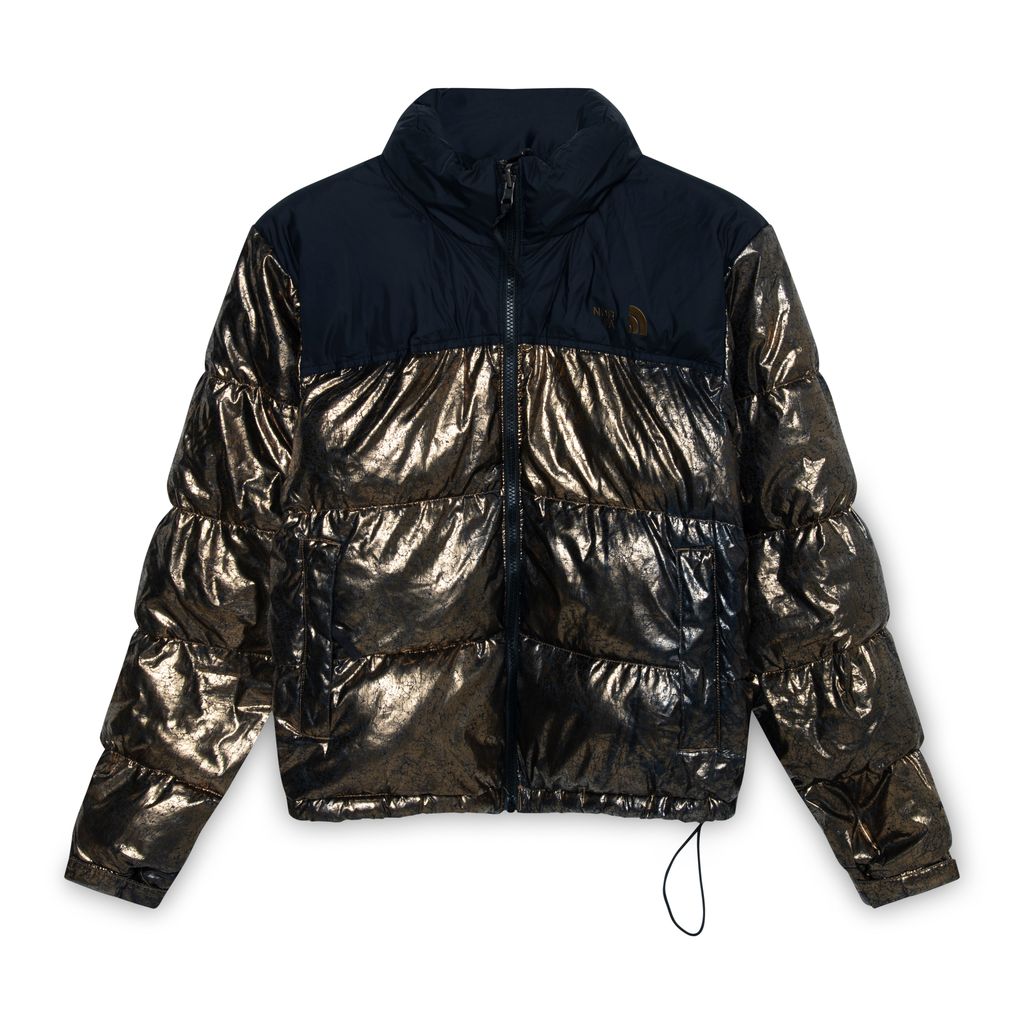 The North Face Metallic Puffer Jacket in Gold features padded interior, front pockets, and front zip fastening.