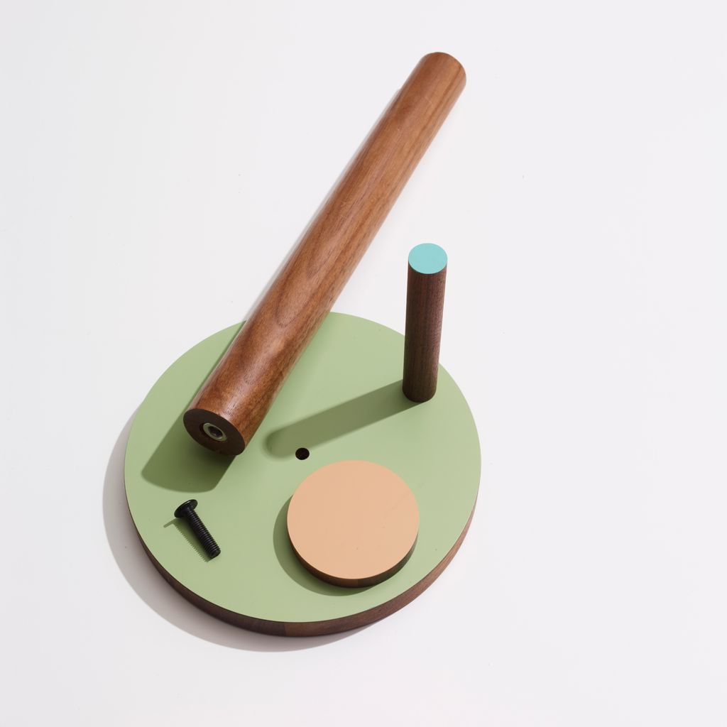 The Paper Towel Keeper is thoughtfully designed, colorful and built to last. A magnetized top secures the roll in place and a magnetized stopper arm can be adjusted to stay flush with the roll and prevent wobbling. In solid walnut with powder-coated magnetic components.