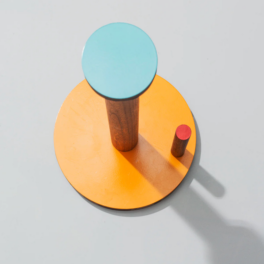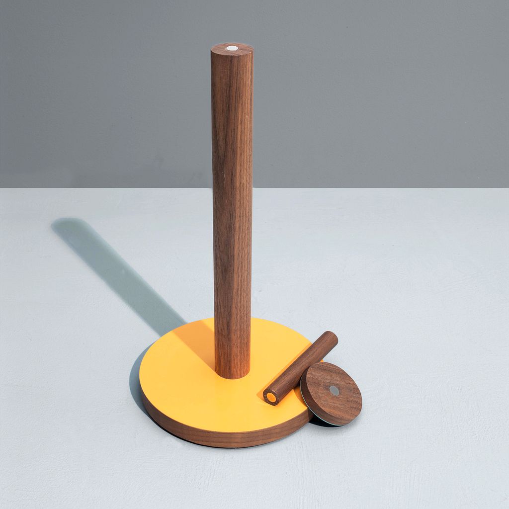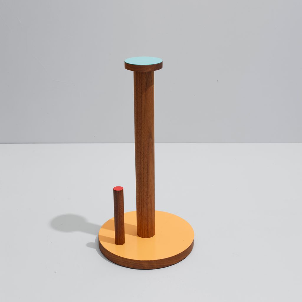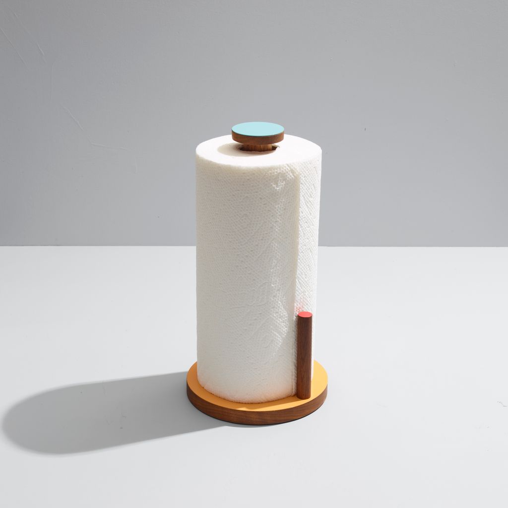 The Paper Towel Keeper is thoughtfully designed, colorful and built to last. A magnetized top secures the roll in place and a magnetized stopper arm can be adjusted to stay flush with the roll and prevent wobbling. In solid walnut with powder-coated magnetic components.