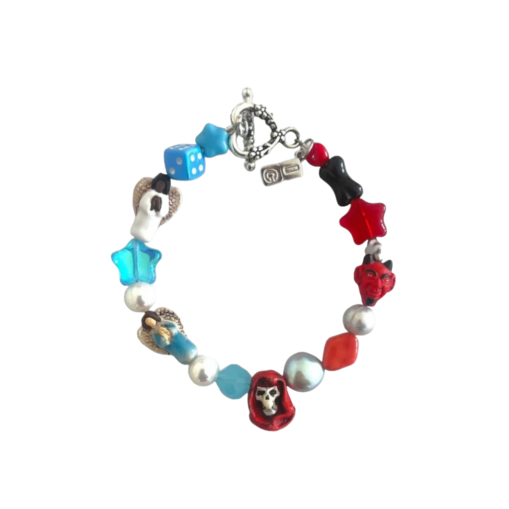 The Purgatory Bracelet features multi-color beads, freshwater pearls, and silver-tone hardware.