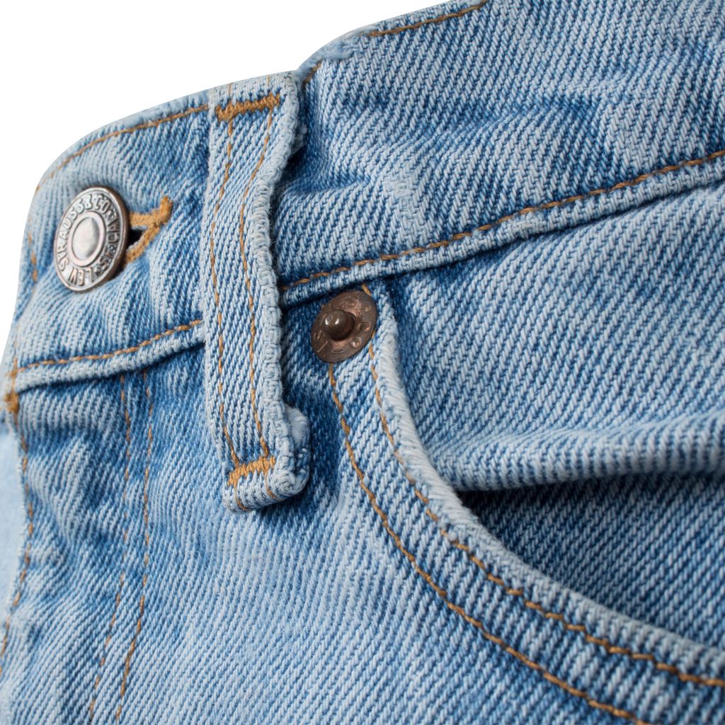 These Vintage Twin light wash Levis are the perfect jean for just about everything. Naturally aged, these jeans have a front button-zip closure, functional side and back pockets, and have a tapered silhouette. Gently worn, frayed at ankle and waist.
