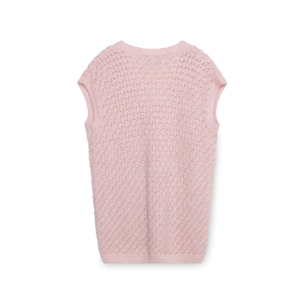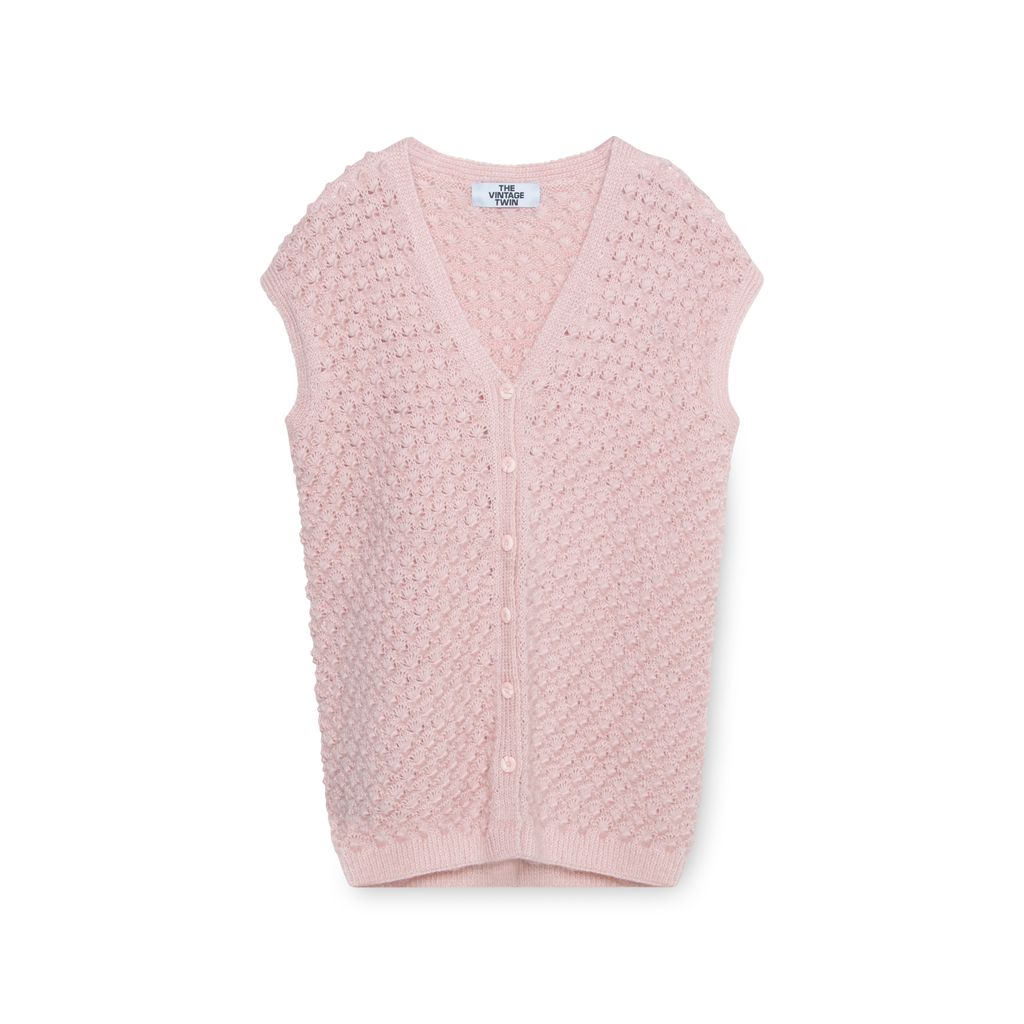 The Vintage Twin Pink Sweater Vest features front button closure and seashell knit pattern.