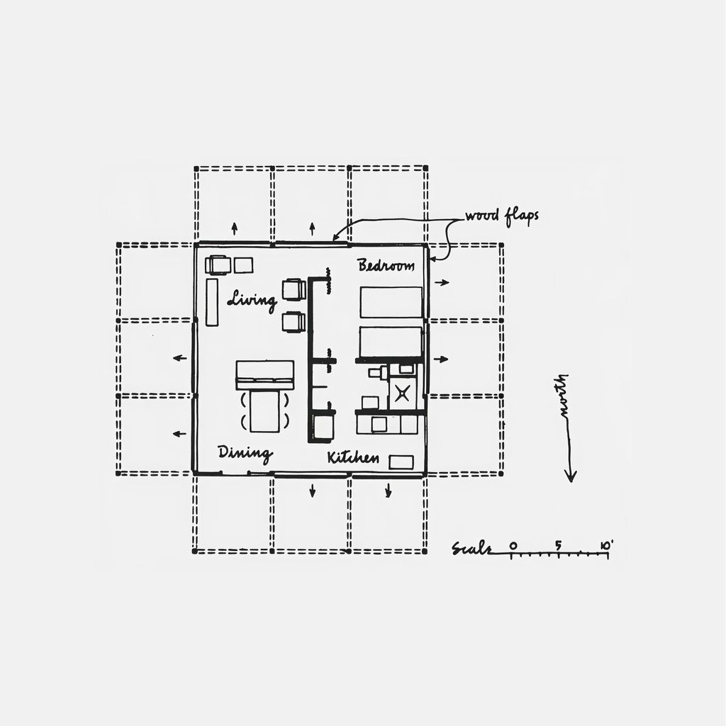 The house's most distinctive feature is its system of adjustable exterior wooden panels, raised and lowered by 77-pound, red-painted cannonball counterweights sourced from its original site on Sanibel Island, Florida. When closed, they function as shutters; when opened, they form shaded canopies — allowing the structure to continuously transform in response to light, climate, and use. The Walker family and Sanibel residents nicknamed it "The Cannonball." Rudolph believed people need both "caves" and "goldfish bowls" to live in; this house delivers both within a single architectural form. He described his earliest designs as "sketches in the sand" and the finished structure as something that "crouches like a spider in the sand" — alive to its environment in a way few buildings ever achieve.