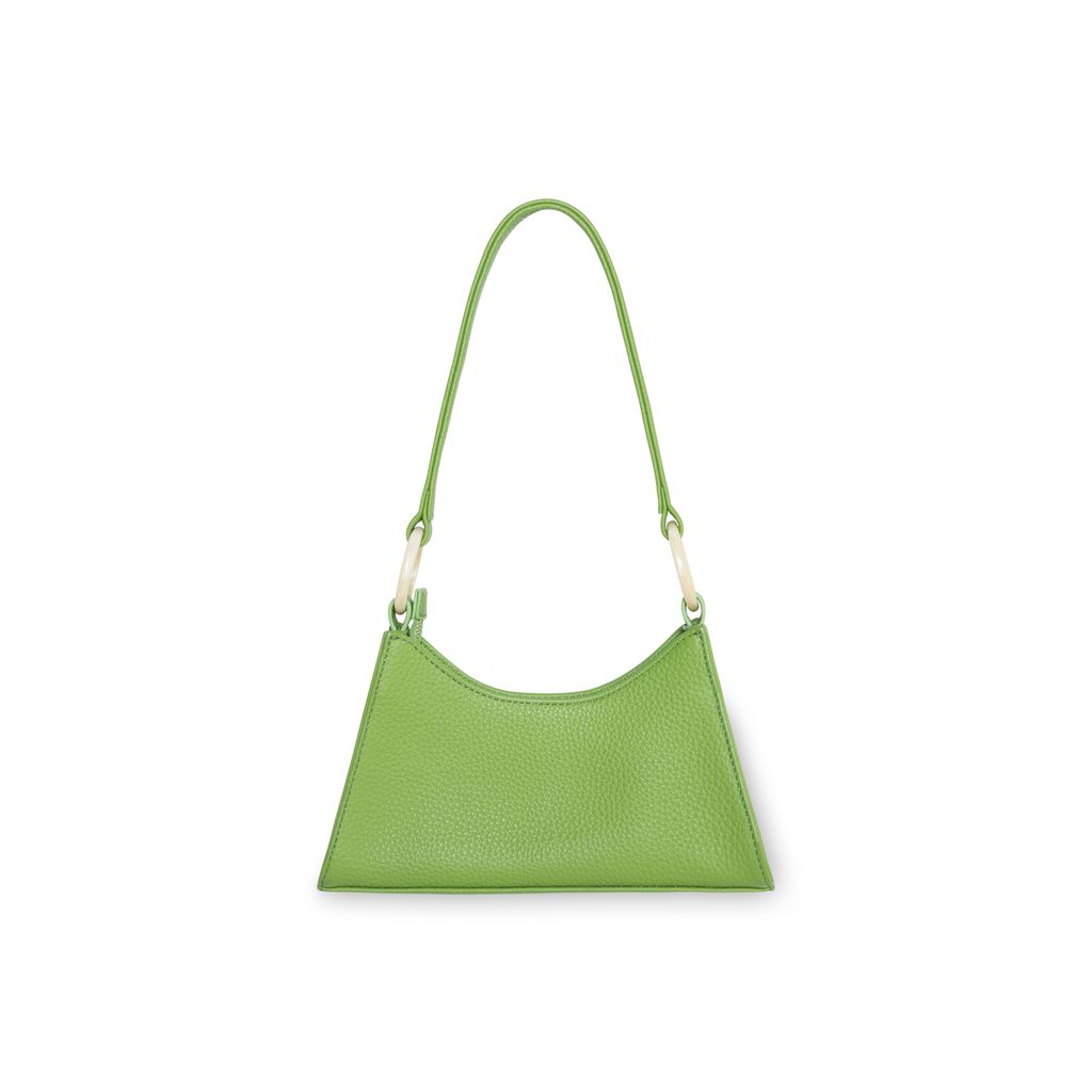 The Wolf Gang Lola Mini Shoulder Bag in Green features structured mini bag with resin acetate ring detail, internal gold zip closure, signature gold foil logo, and 100% natural hemp lining.