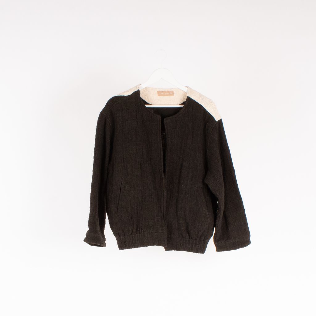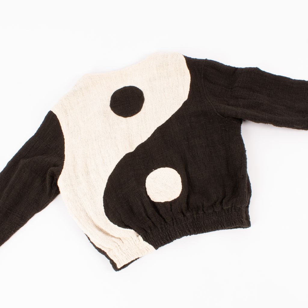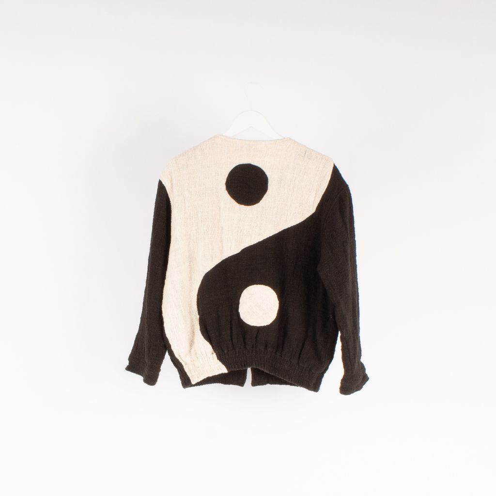This sustainably made and dyed bomber from Australian brand The Wylde will have you feeling all kinds of zen. Features yin yang design on back, plant dyed for color, open front, side front pockets, and elastic waist.