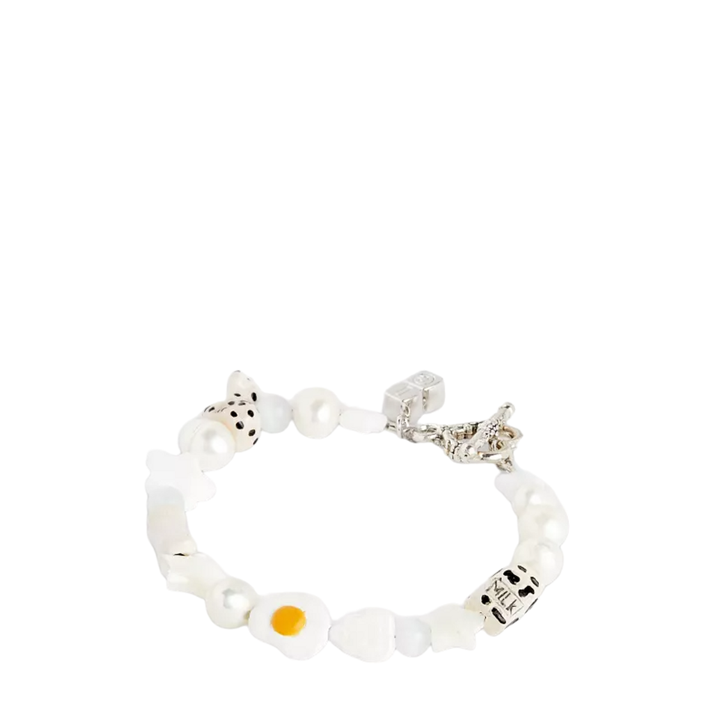 The Yo Yo Bracelet features multi-color beads, freshwater peals, and silver-toned hardware.