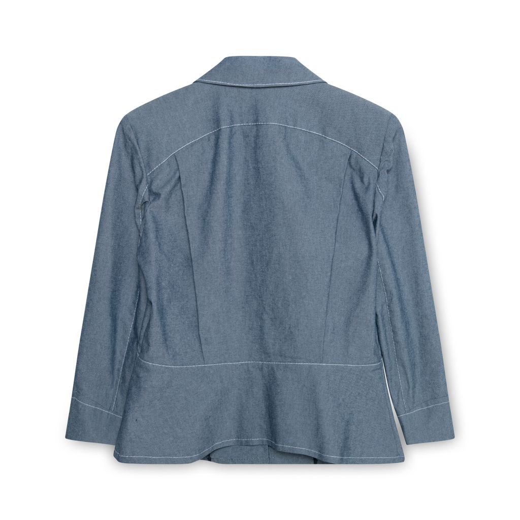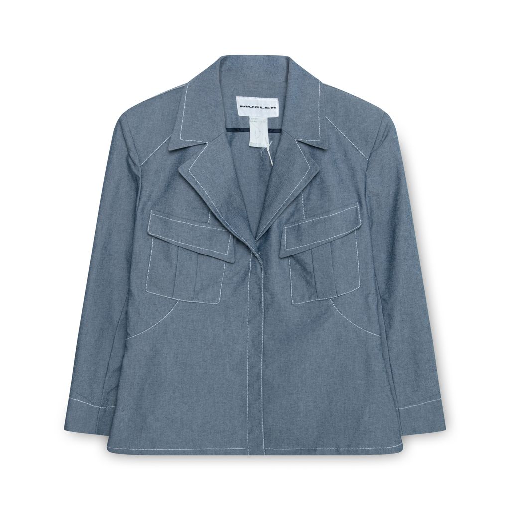Thierry Mugler Blue Jacket features white contrast stitching, shoulder pads, front snap button closure, 2 chest pockets, and dart detailing on back.