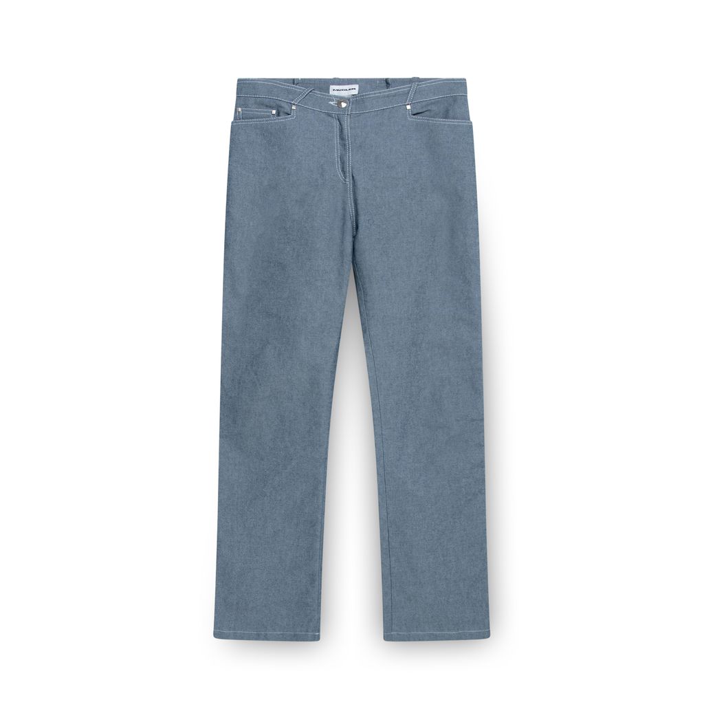 Thierry Mugler Blue Pants features white contrast stitching, silver hardware, 5 pocket styling, front zip closure, and slight flare.