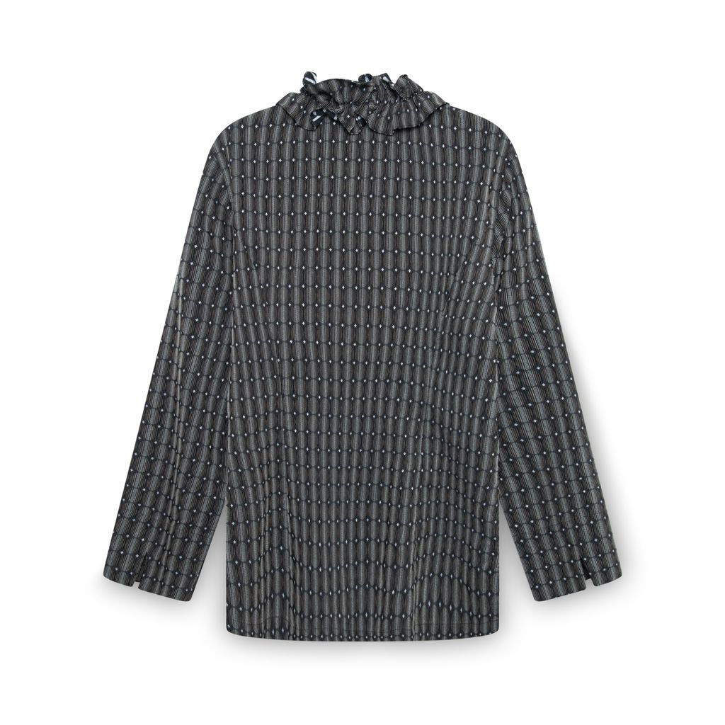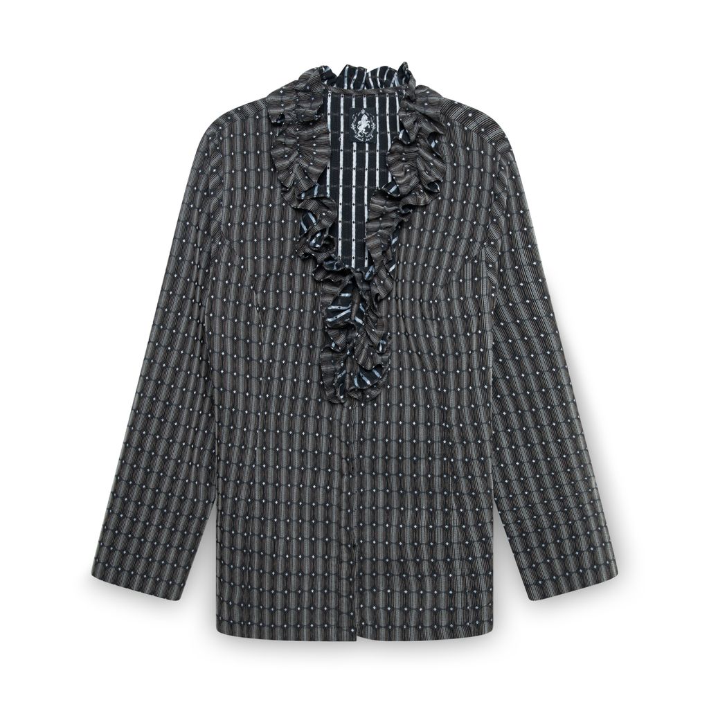 Think Tank Ruffle Collar Brown Button Up Shirt features matching belt, front button closure, and all over print.