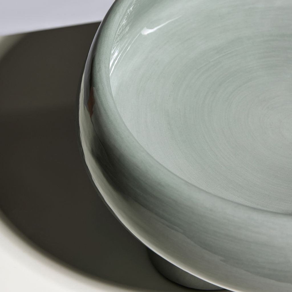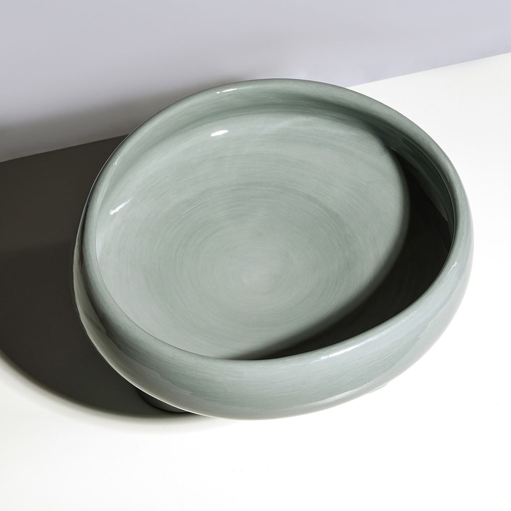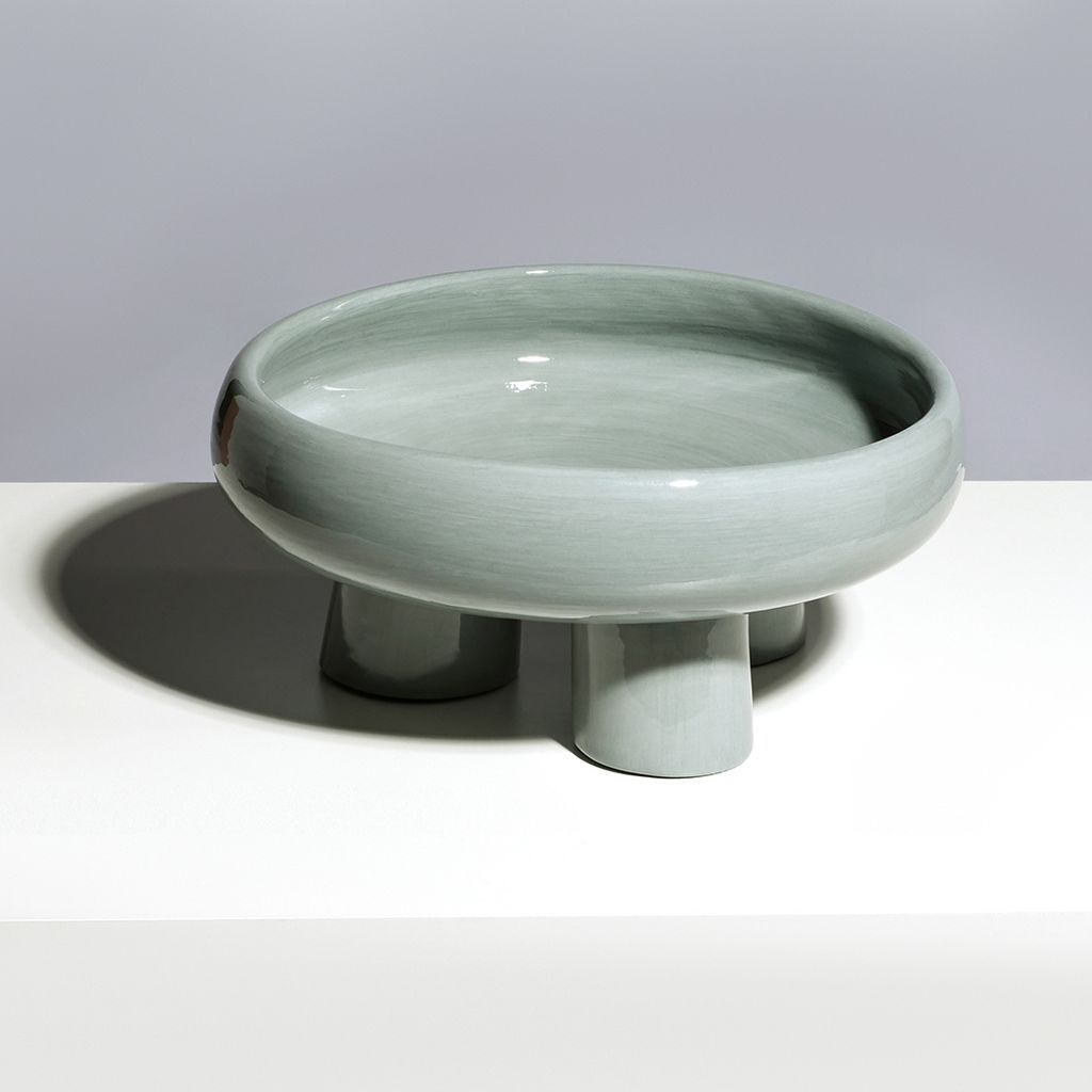 Plate made of a rounded base with lateral edges, supported by three cylindrical legs. Hand-painted in solid colors using the Engobbio technique.