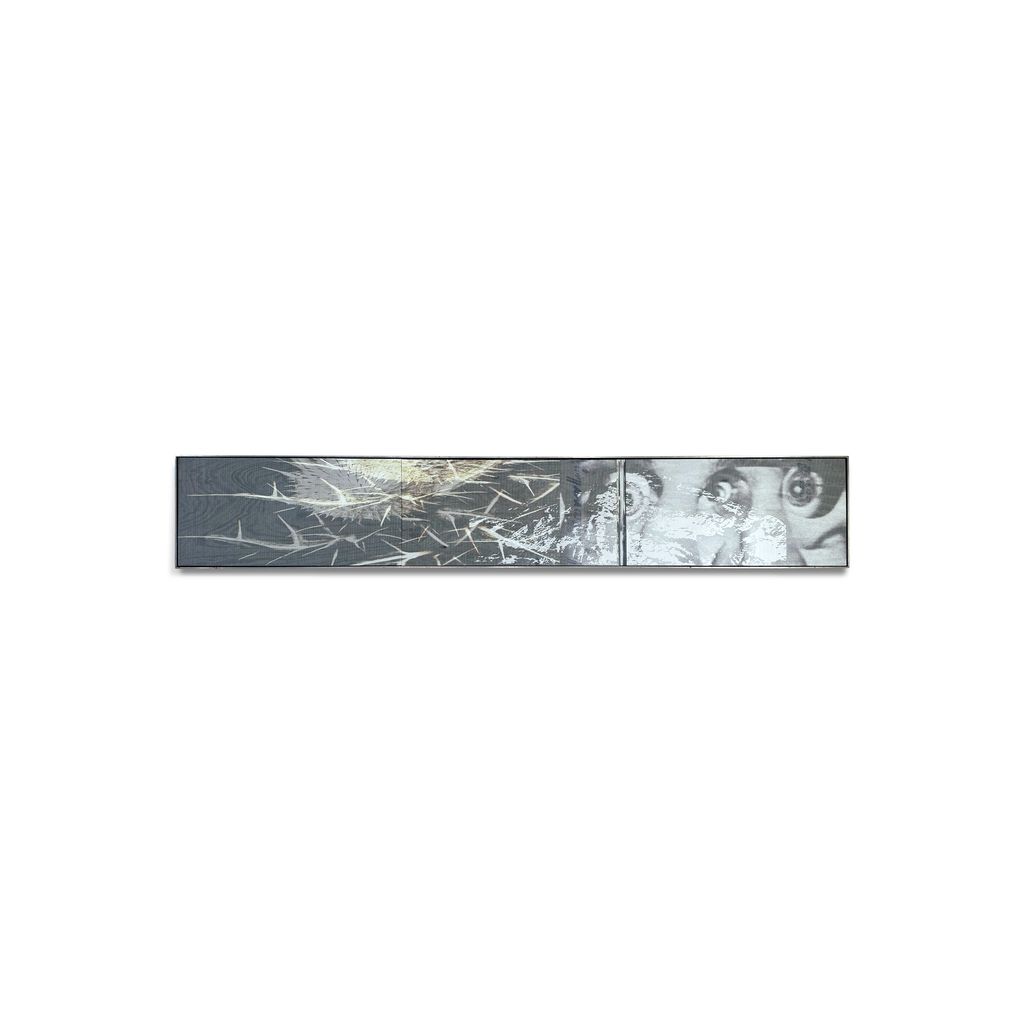 Spray paint and perforated vinyl adhered to stained plywood, framed