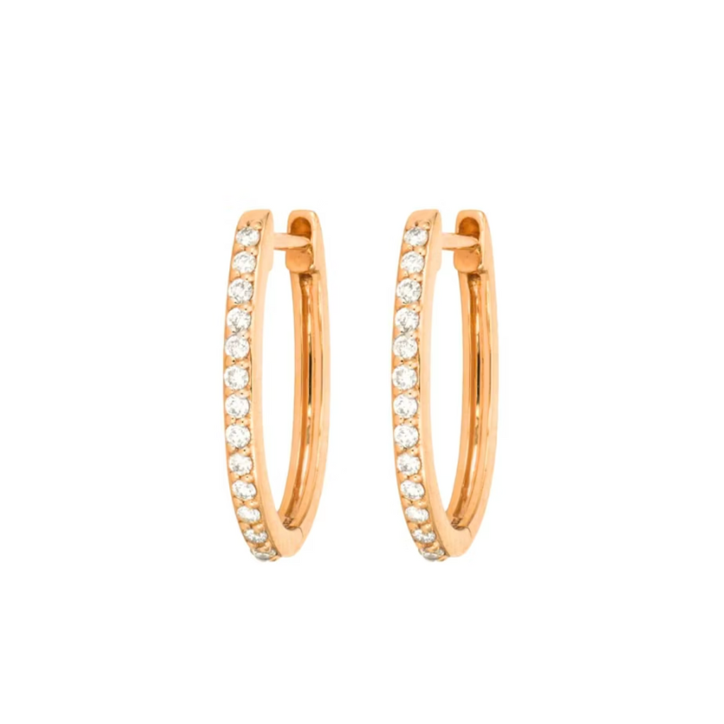 Diamond hoops , perfected. These Classic Small Oval Pavé Hoops by Three Stories are crafted in warm 14K rose gold and lined with sparkling pavé-set round diamonds. Timeless yet modern , their softly elongated oval silhouette makes an effortless statement , elegant worn solo , or endlessly customizable with your favorite Three Stories charms. A forever staple designed for everyday shine and personal styling.