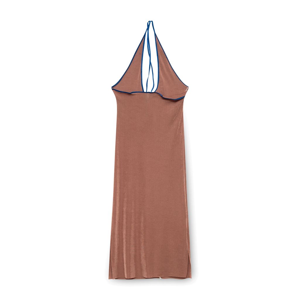 Super stretchy knit slinky maxi dress, with blue elastic key hole trim.