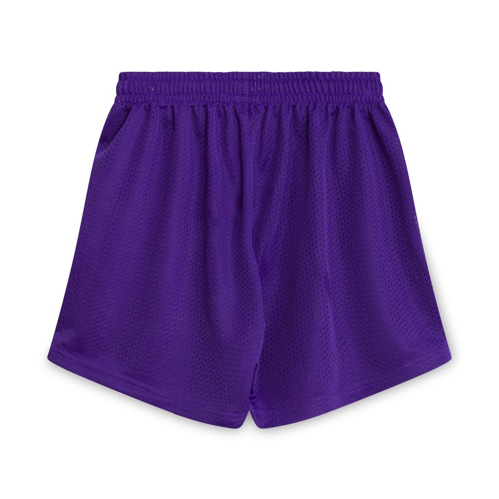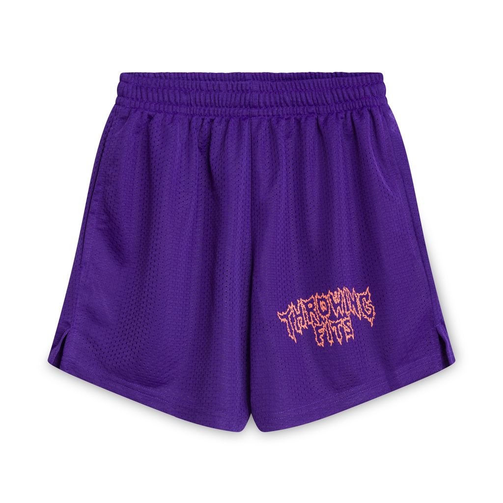 Throwing Fits Purple Mesh Shorts features drawstring waistband and logo on left leg.