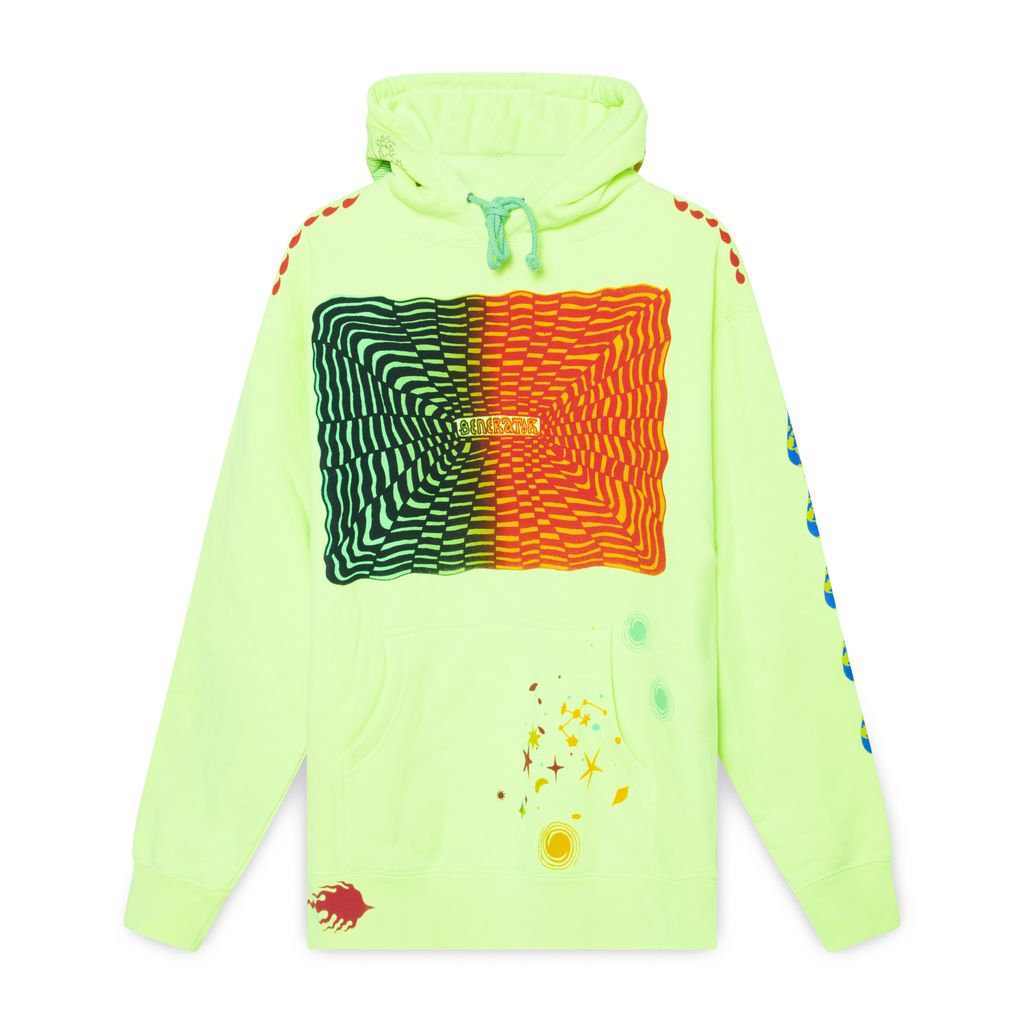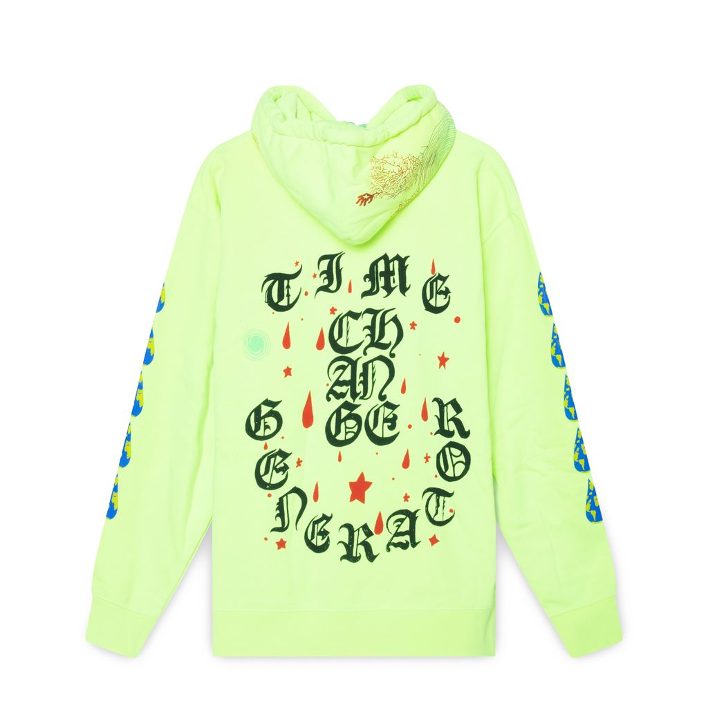 Time Change Generator Hi-Viz hoodie features hand printed puffy designs throughout.