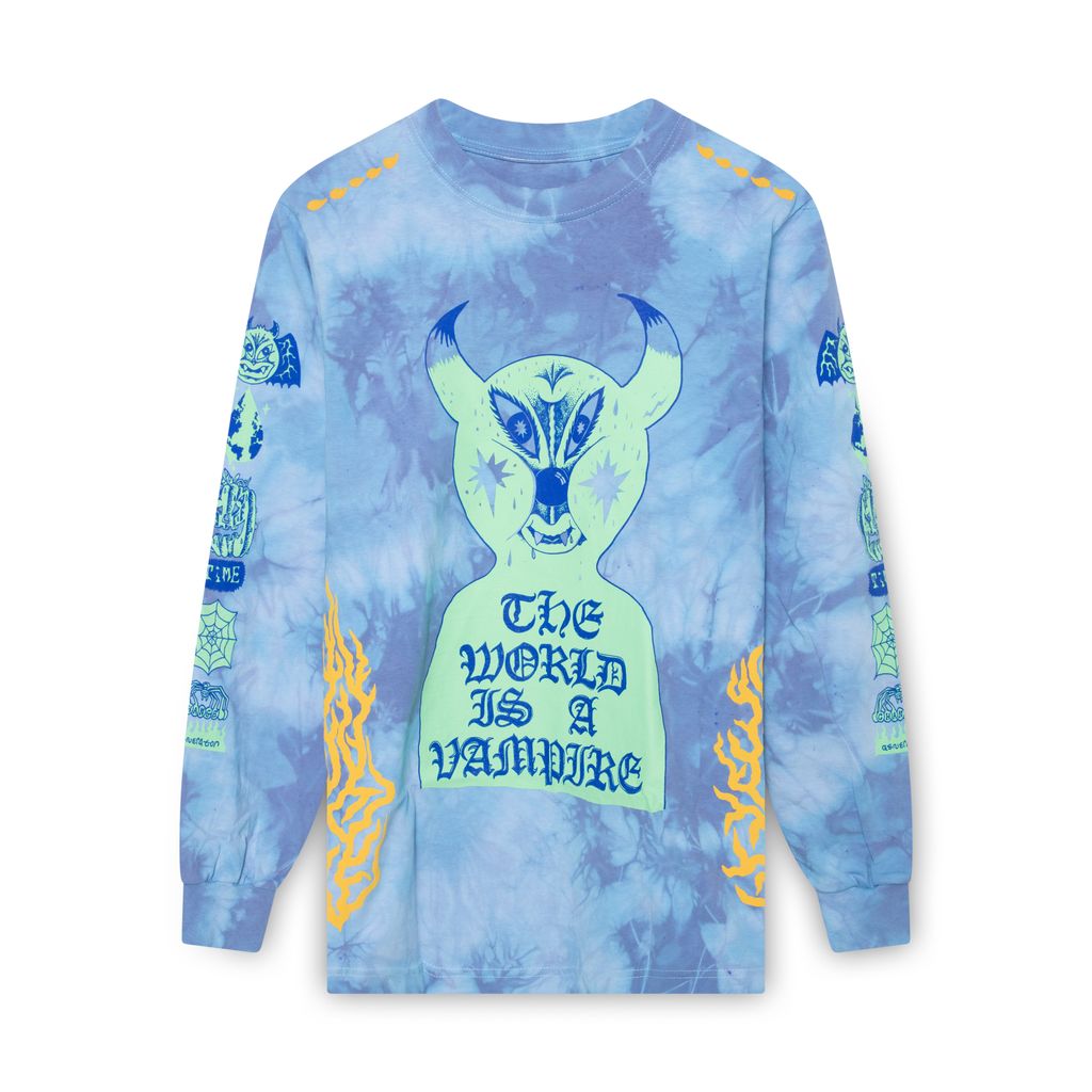 Time Change Generator The World is a Vampire long sleeve t-shirt features hand dyed and puffy printed details throughout.