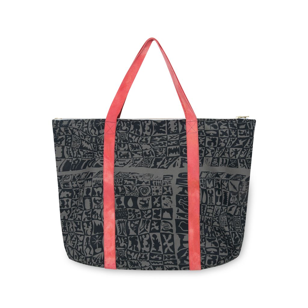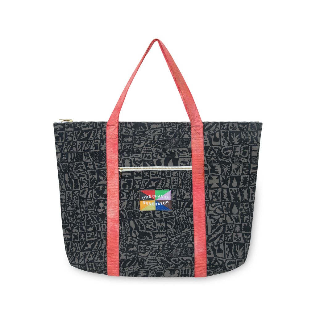 Time Change Generator Variable beach bag features printed design on canvas throughout, dyed straps, patch logo at front, zip pocket, single interior pocket, and zipper closure at top.