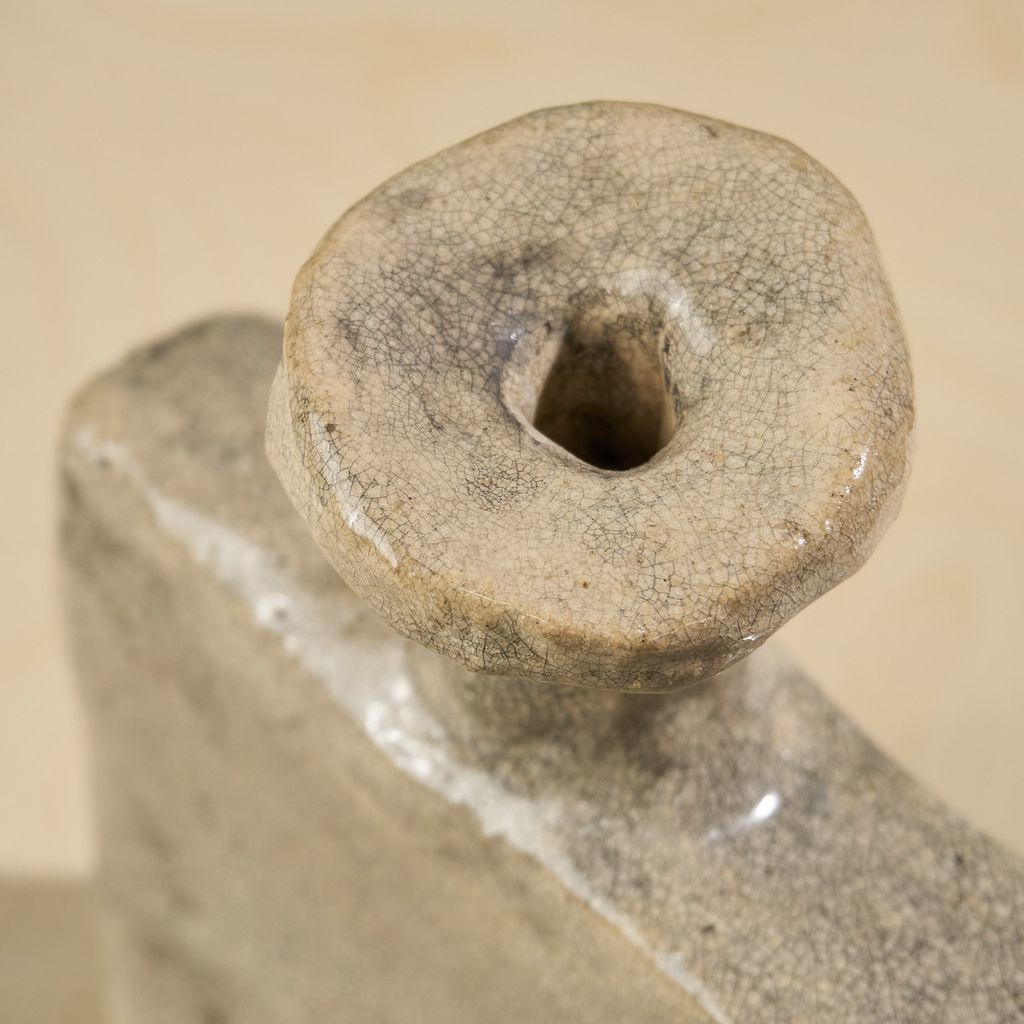 His work often results in sculptural totems that bridge past and present through rough textures and visible construction marks. In his earthenware practice, Van Hooff applies simple architectural principles, treating clay as a building material rather than a decorative medium. Using a horizontal construction method, he builds solid cores that emphasize structure, weight, and balance, celebrating imperfection, material honesty, and the enduring value of the handmade object.