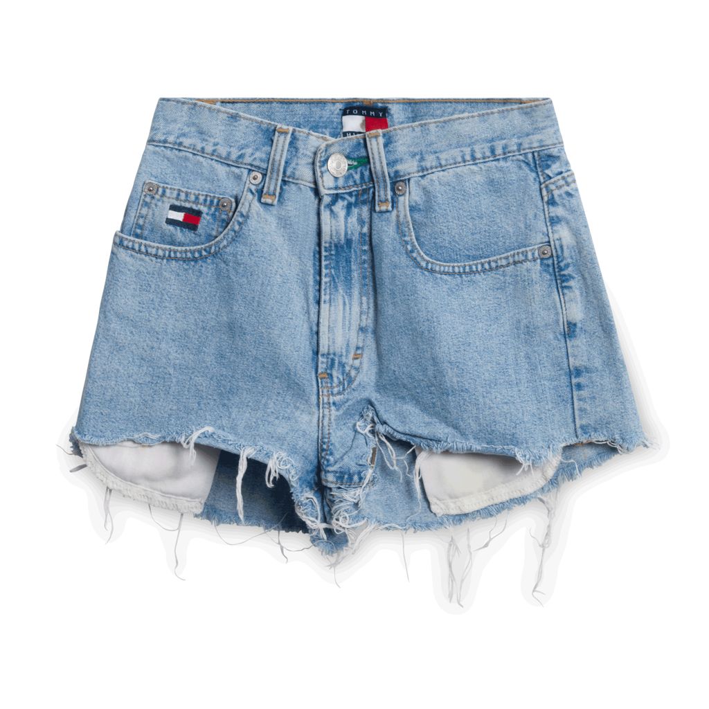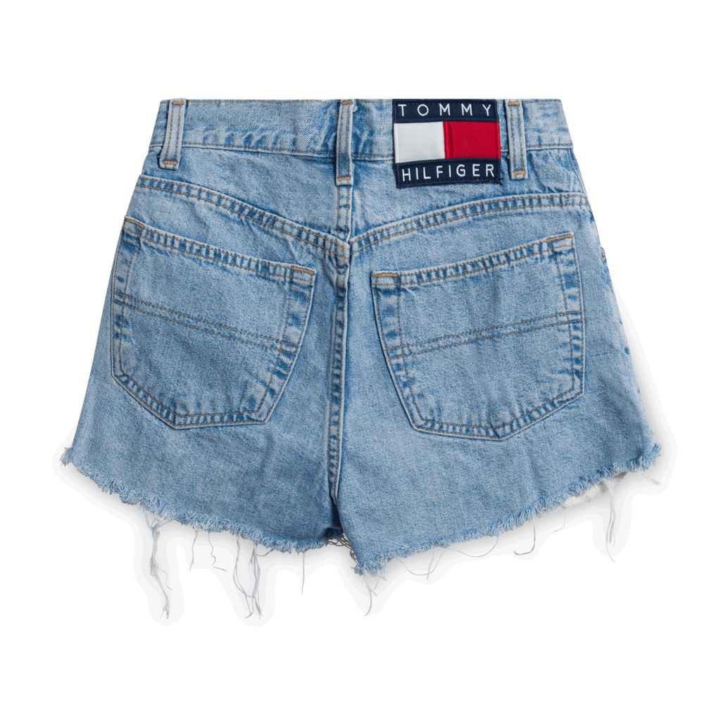 Features distressed trim legs and signature Tommy Hilfiger text and logo patch on the back