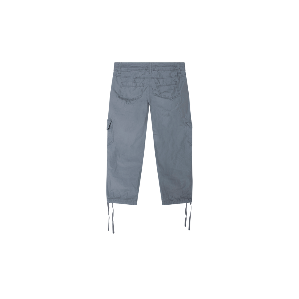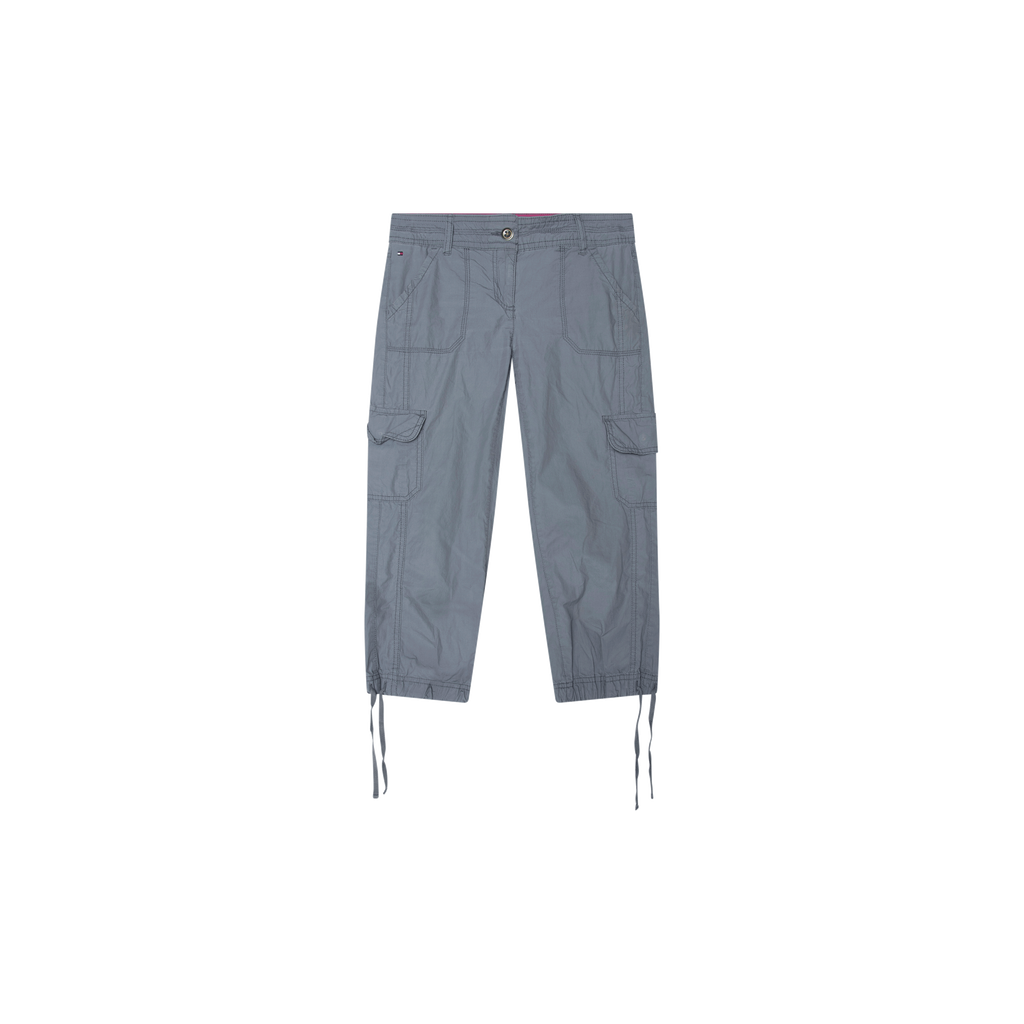 Tommy Hilfiger Grey Cargo Capris features front zip closure, 6 pocket styling, adjustable drawstring leg openings.