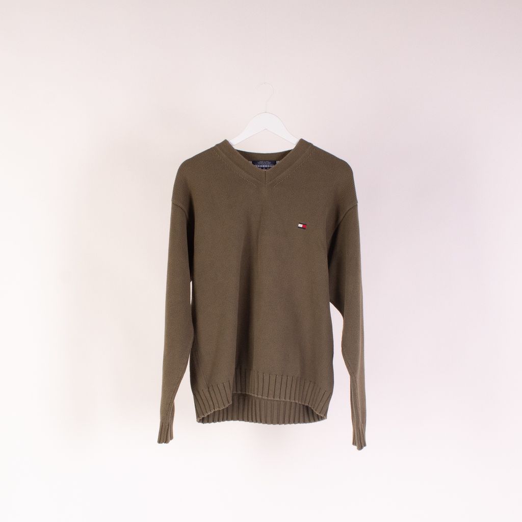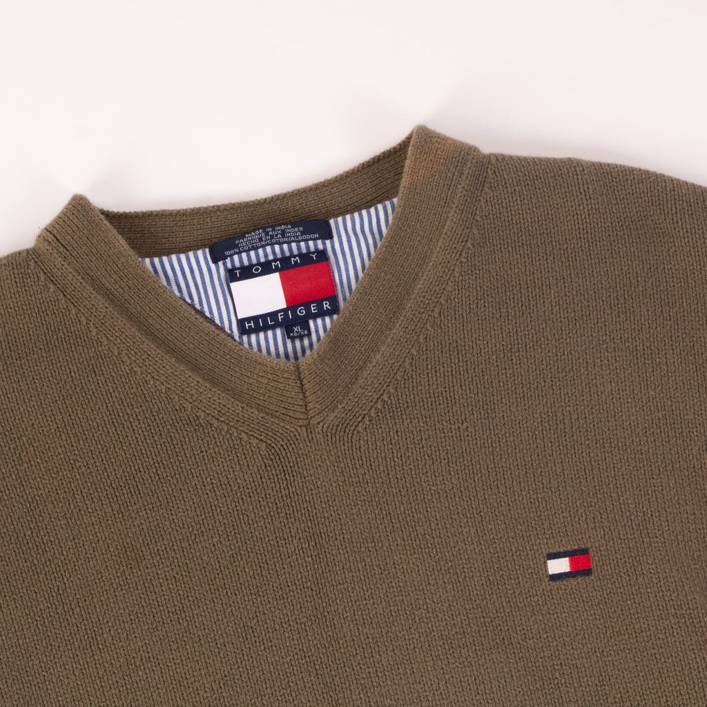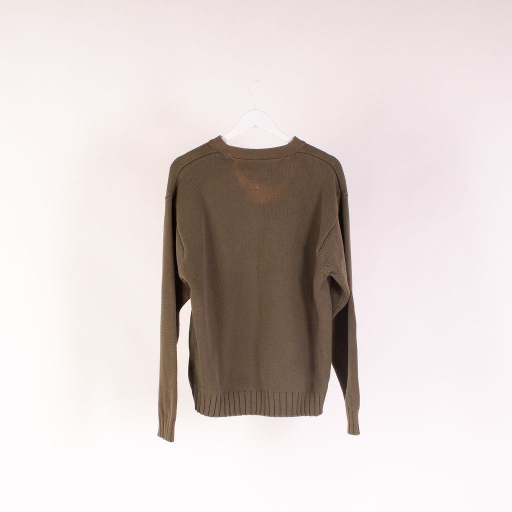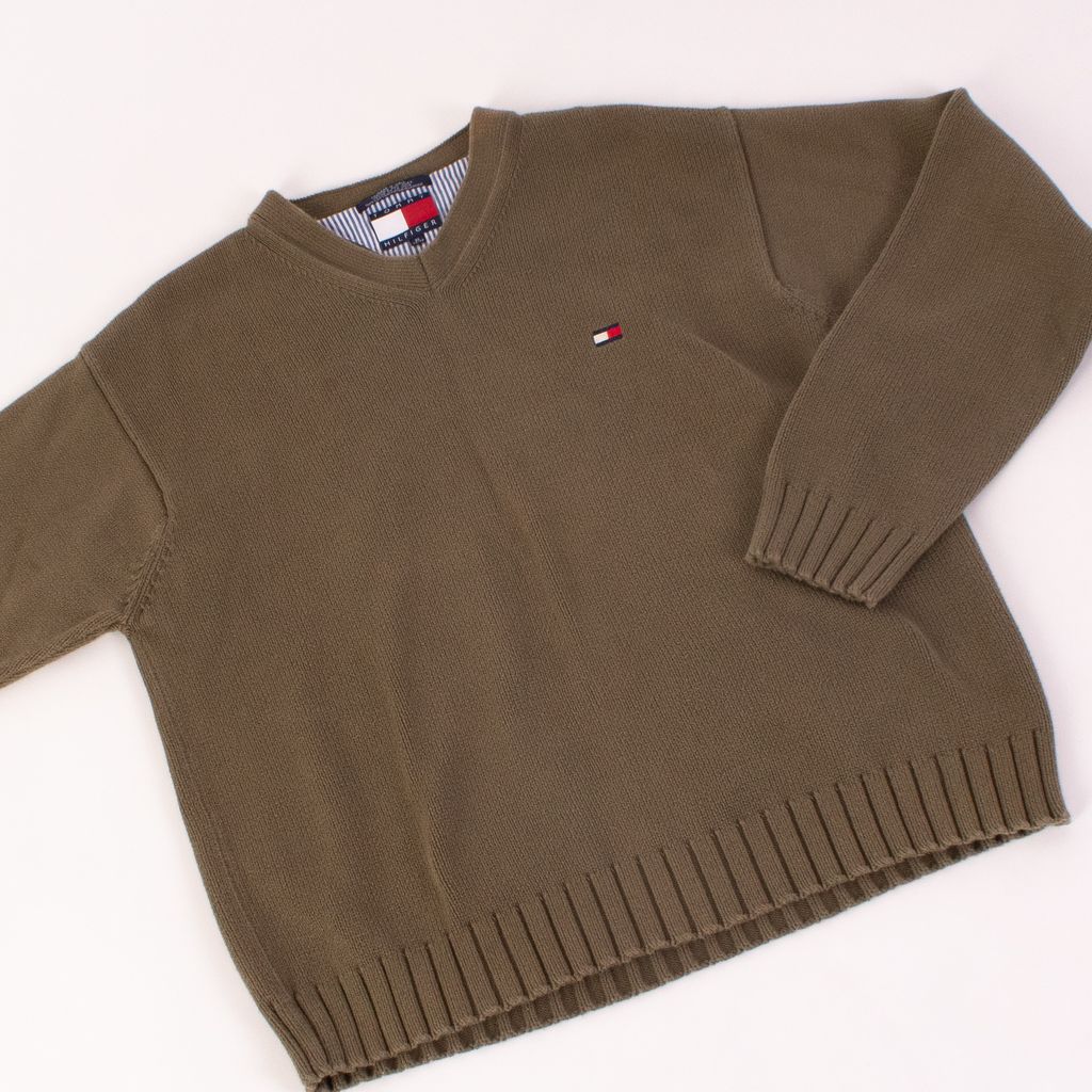 This sweater from Tommy Hilfiger's main line, is peak cozy with it's heavy knit and oversized body. Features Tommy Hilfiger logo embroidery on chest, rib knit waist and cuffs, and minor signs of wear. Signs of wear include large stain, possibly from bleach, on the back at the neck.
