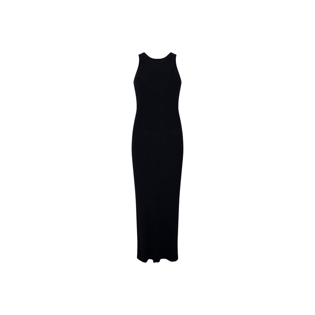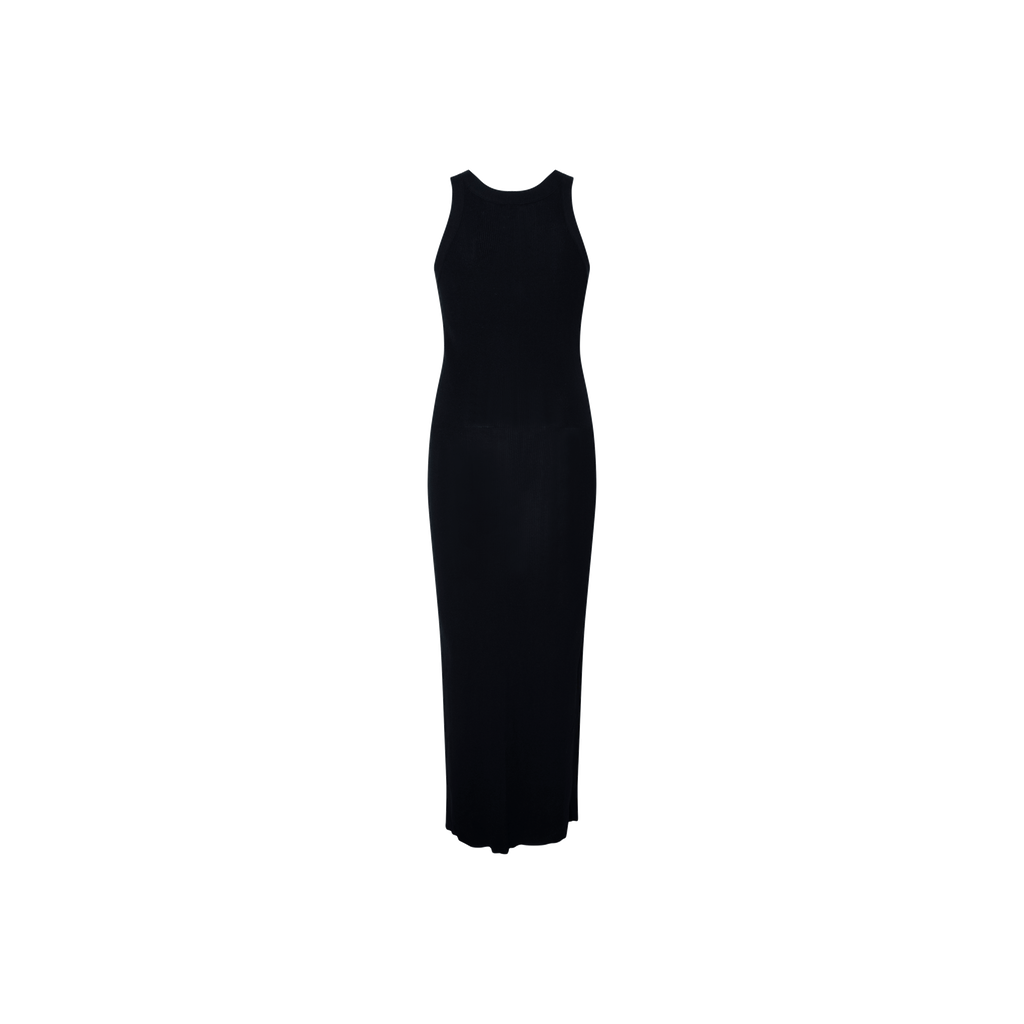 Toteme Black Seamless Midi Dress features seamless construction, crewneck, racer back, rib knit viscose, and recycled nylon blend.