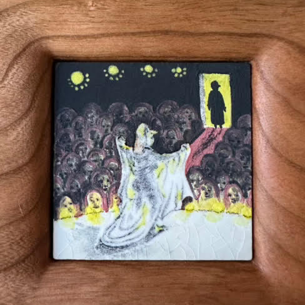 Glazed porcelain tiles embedded in oil-sealed cherry artist’s frame.