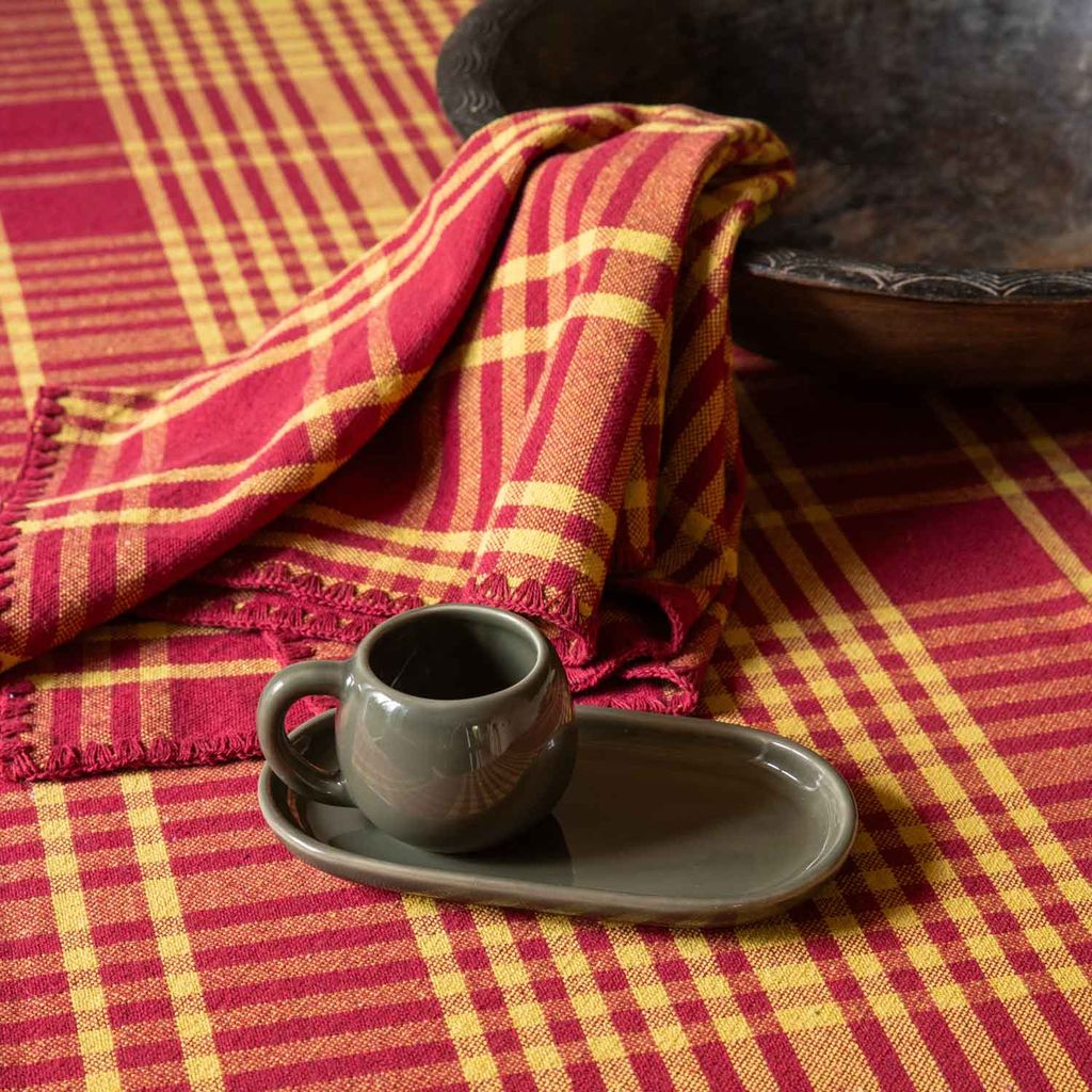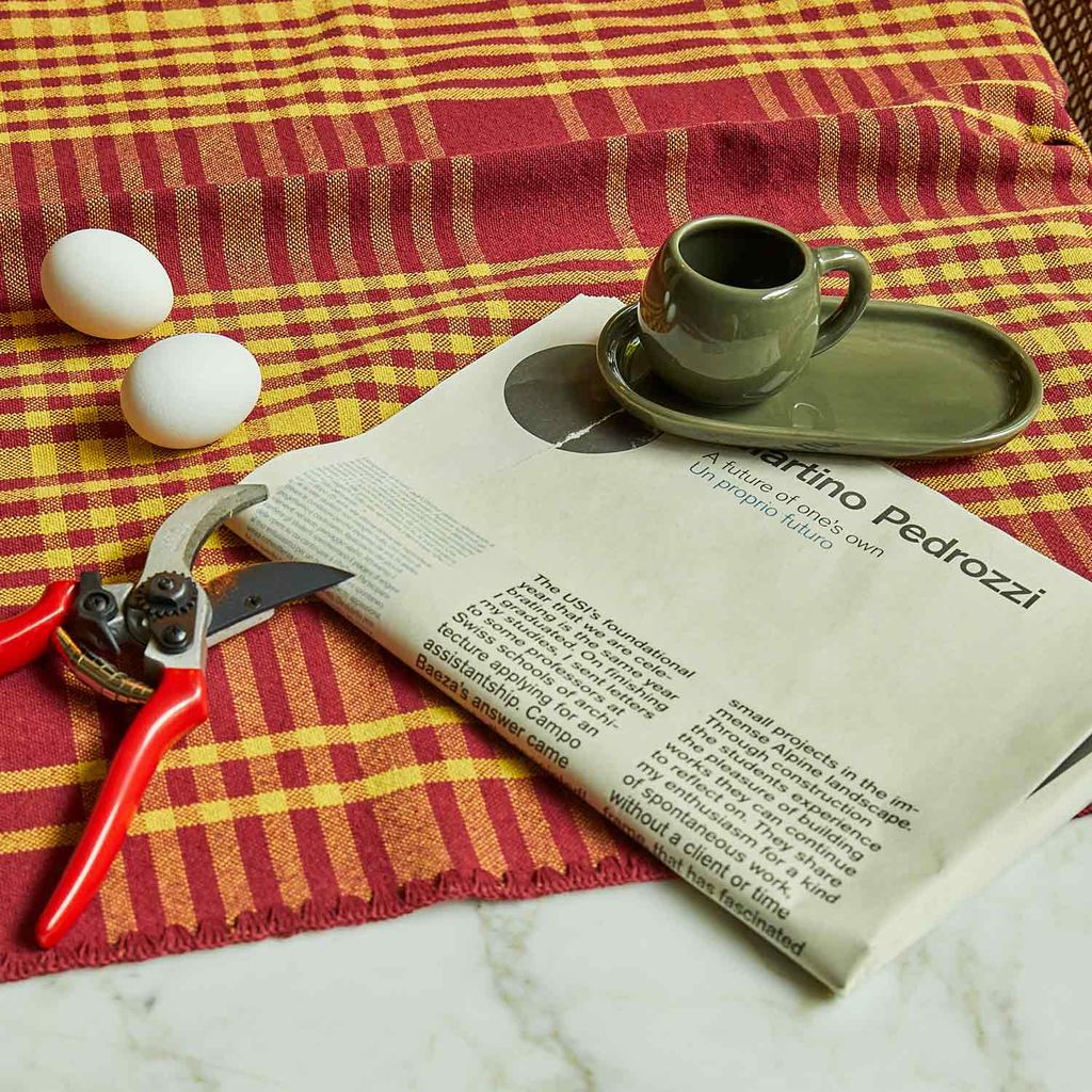 A tribute to traditional trattoria table settings, this cotton check jacquard tablecloth is the perfect dining companion for both indoor and outdoor settings. It features contrasting detail stitching and is available in two sizes. Matching napkins are also available. Made in Portugal.