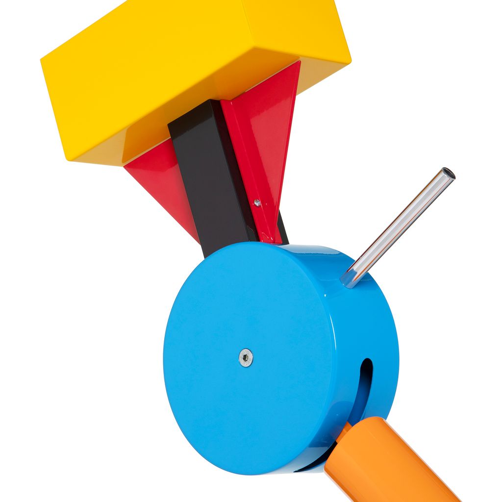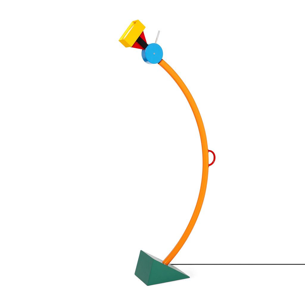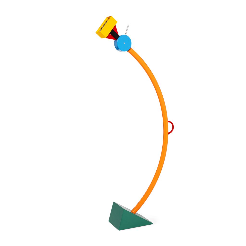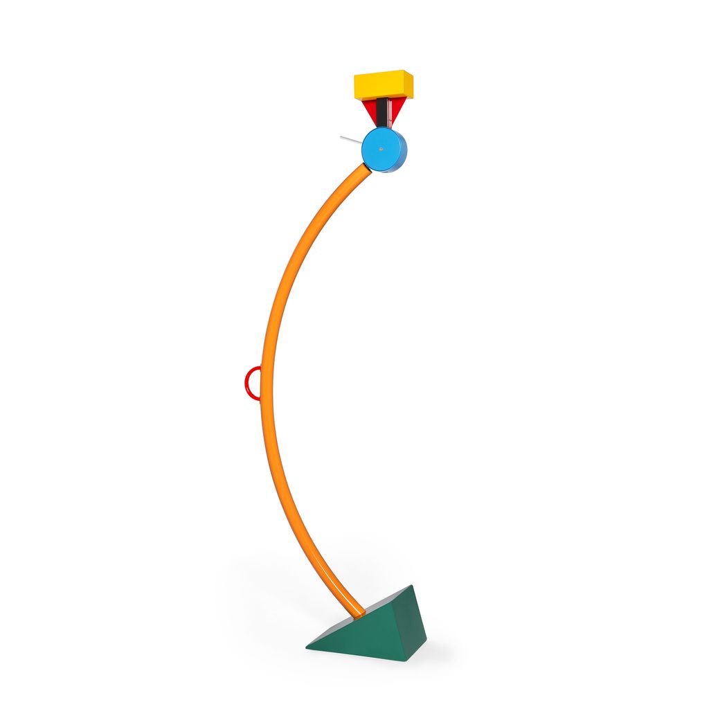 Treetops by Ettore Sottsass, designed in 1981, is a true dynamic presence, slim and colorful, capable of bringing carefree joy to any space with its vivacious charm. The lamp is made in painted metal, with a bulb at the end, for adjustable lighting. The geometric shapes stand out for their vibrant contrasting colors.