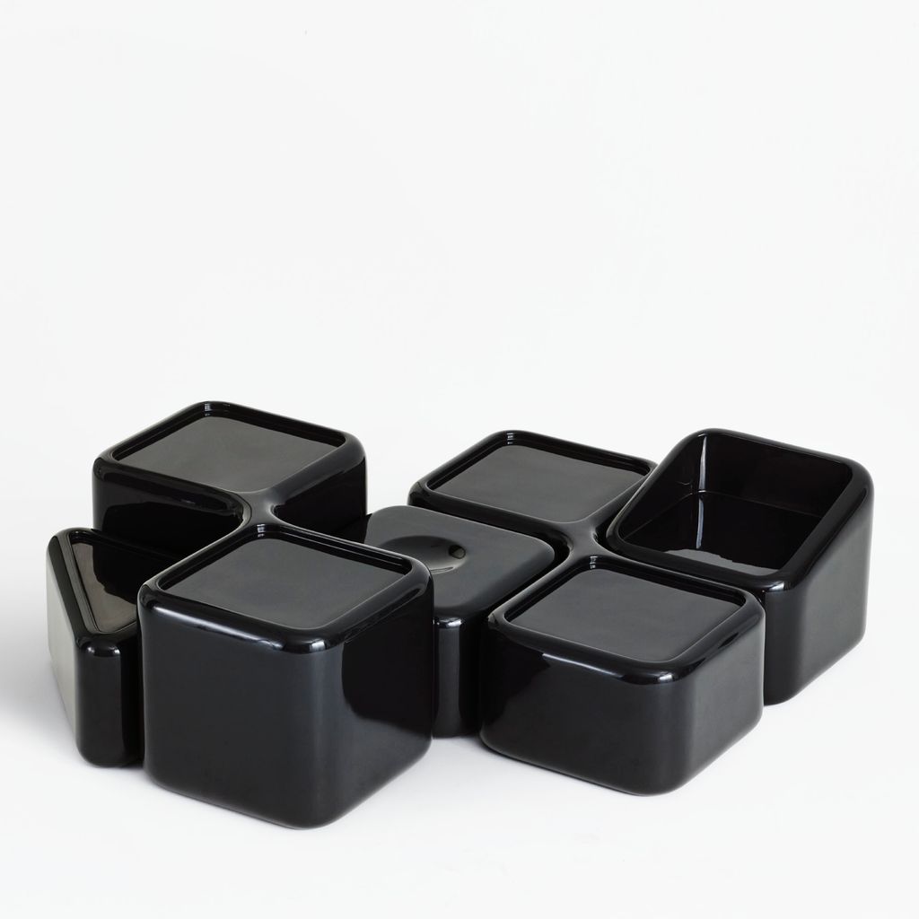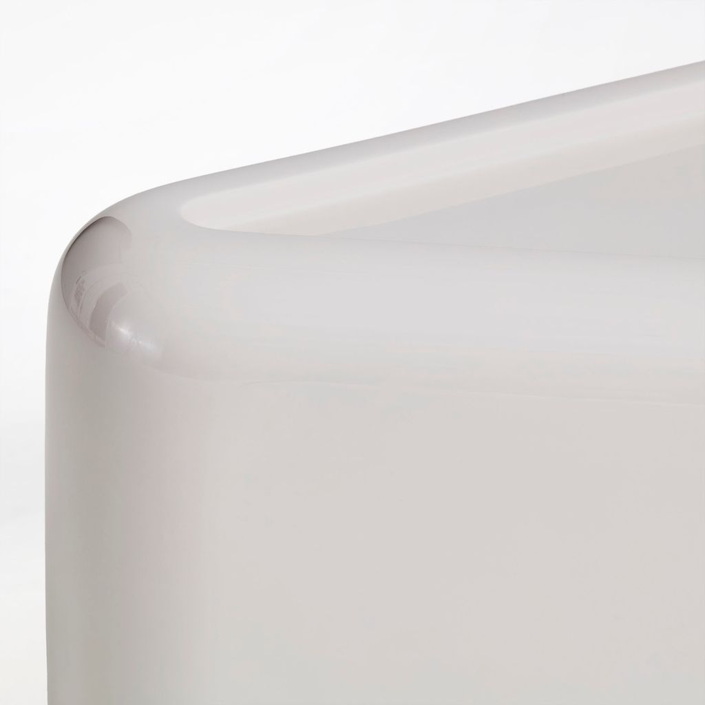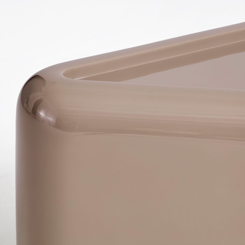 Each table is meticulously handcrafted by master artisans using fiberglass, which is first cast in molds and then manually coated and polished multiple times to achieve different high-gloss finishes. The entire production process is done by hand, requiring a high level of craftsmanship for every piece. The modular tables come in five colors: white, brown, green, red, and anthracite.