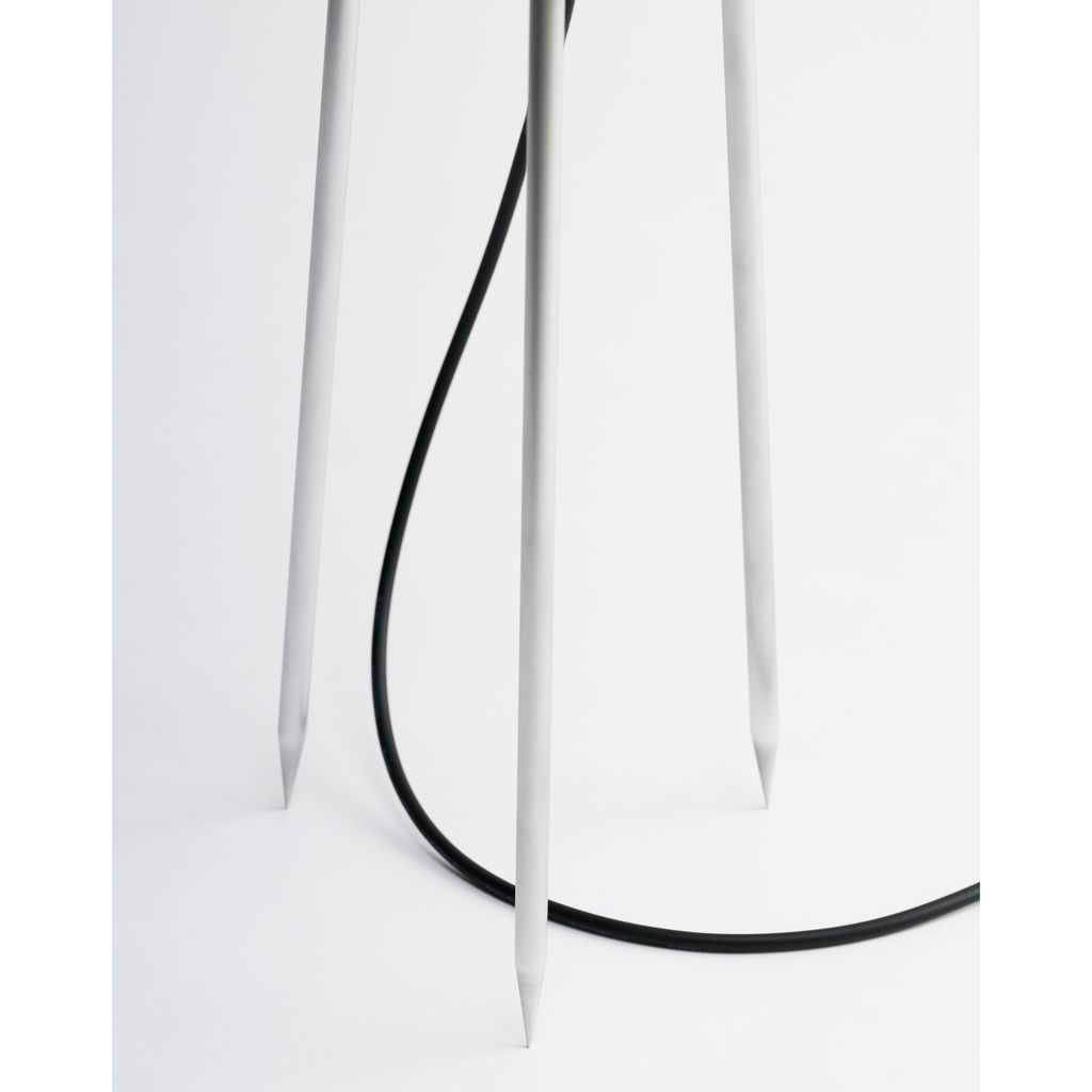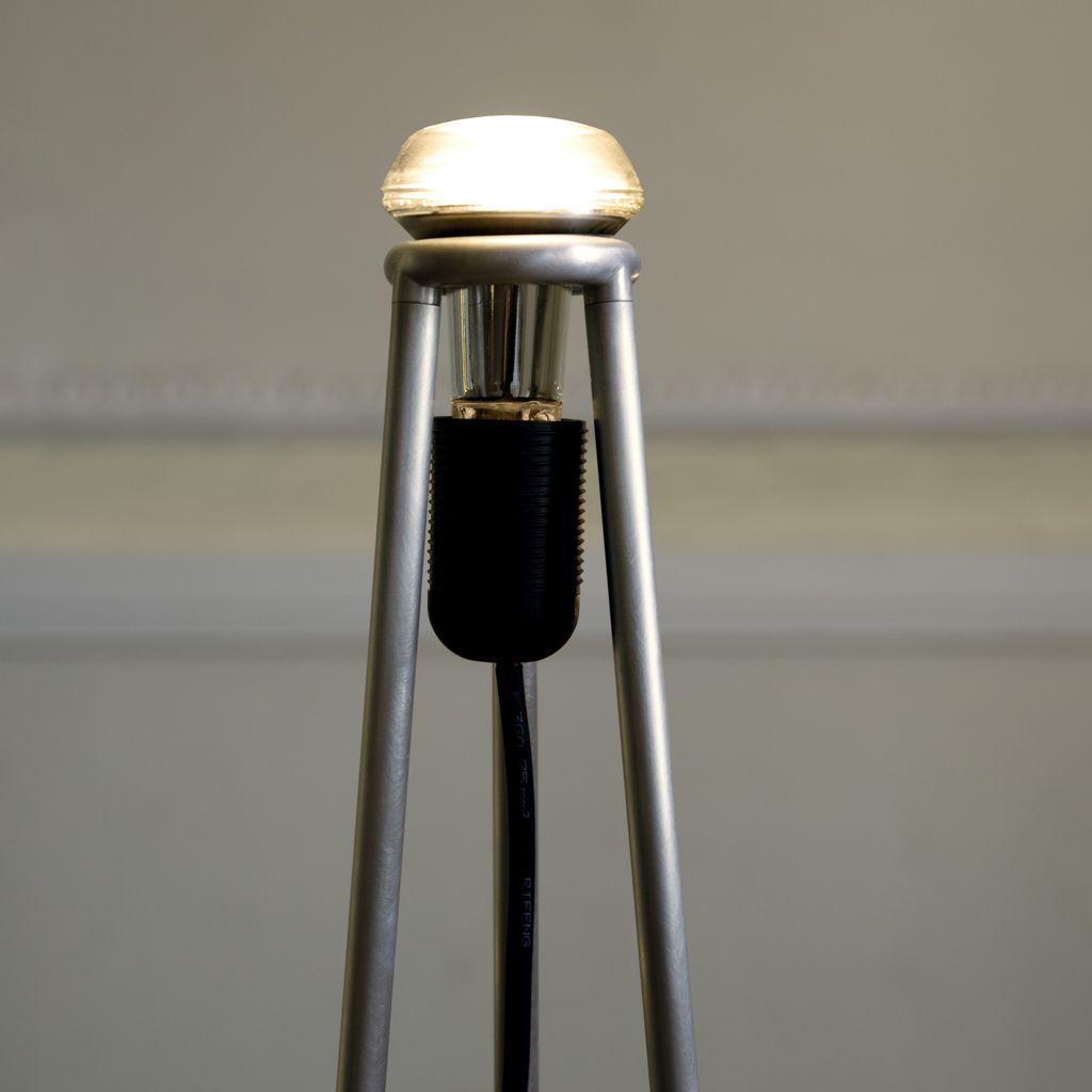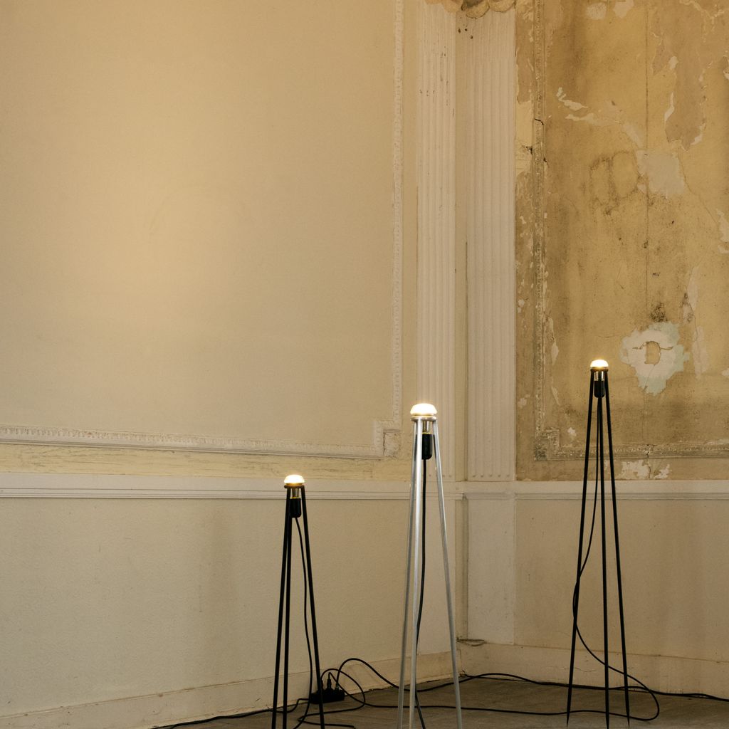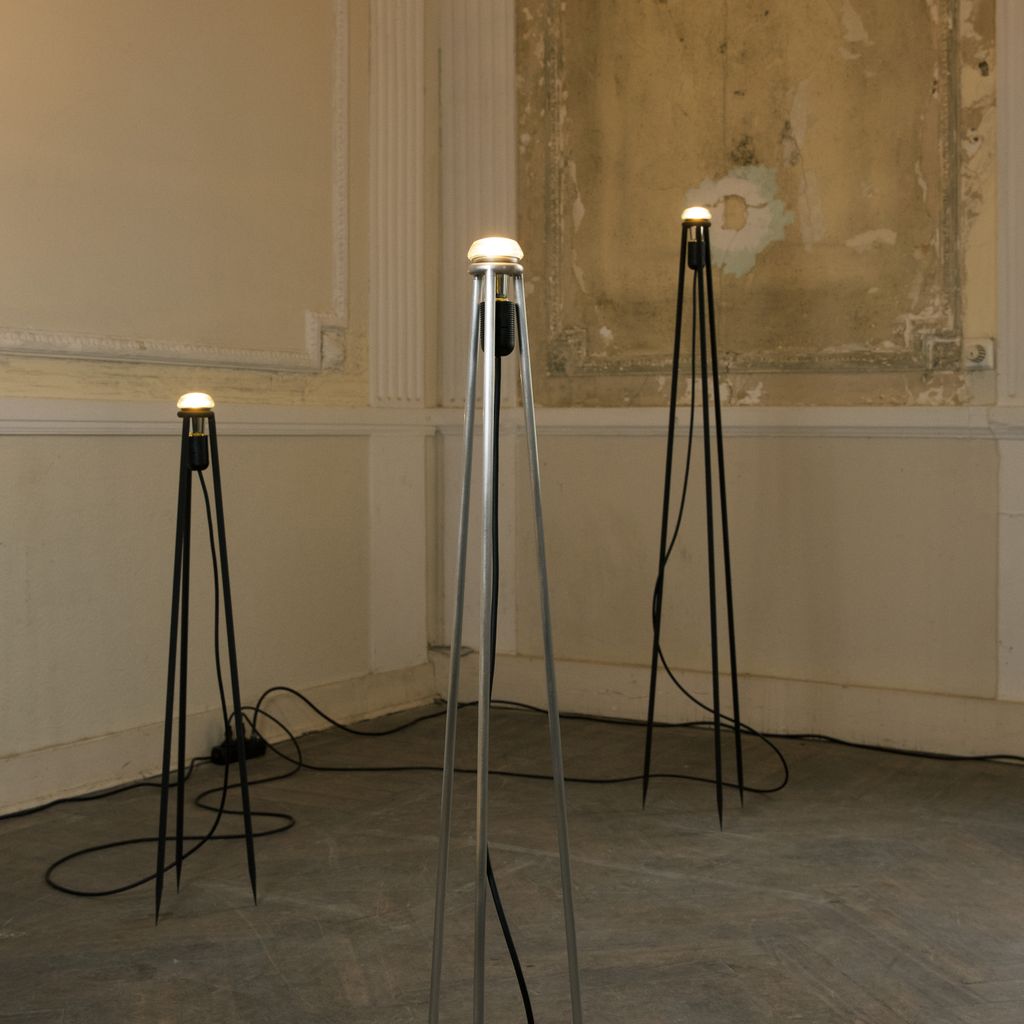 The Trilight consists of cylindric shapes and extruded circles. A CNC-milled ring holds the smart LED bulb and connects the hand-milled legs at an angle to secure a safe stand. All legs have a pointy but slightly rounded end. The surfaces of each piece are carefully brushed by hand for an even finish.