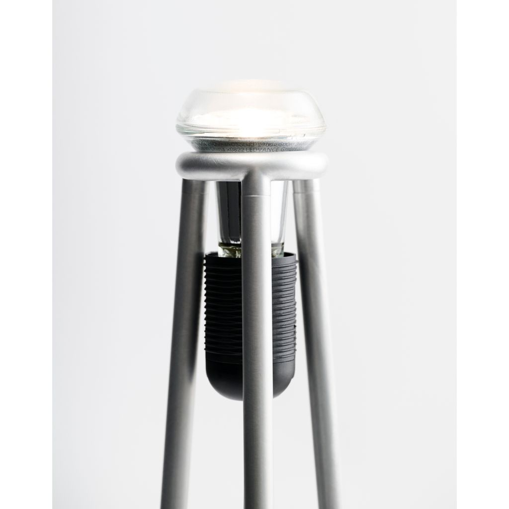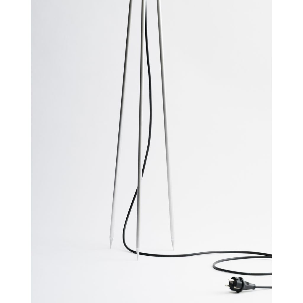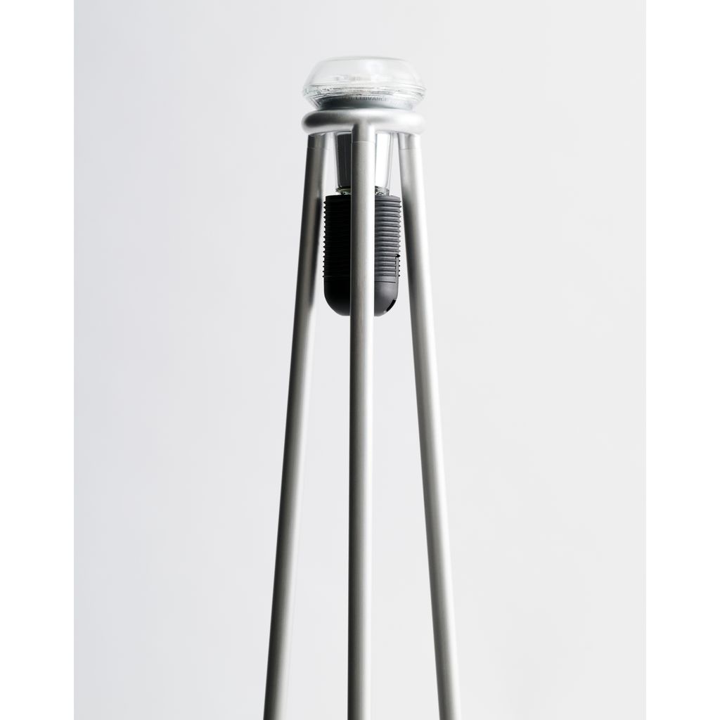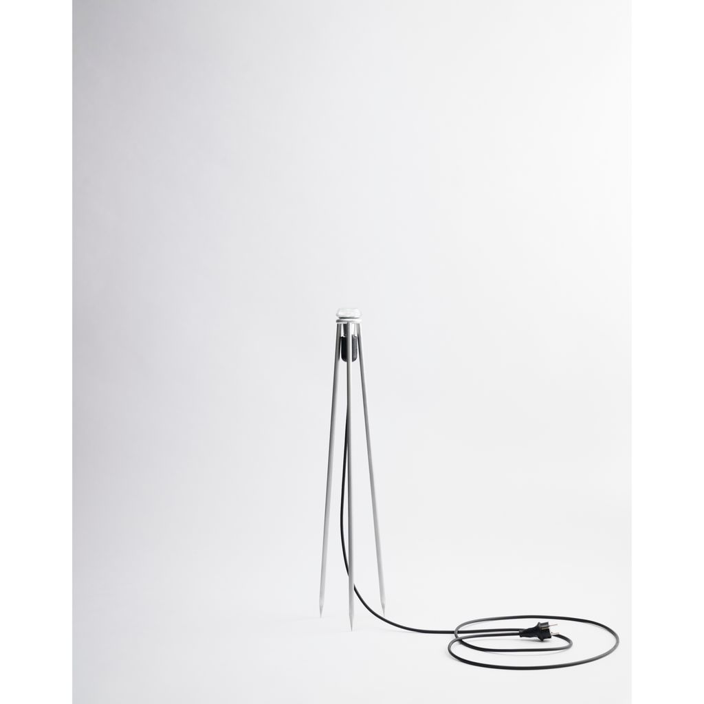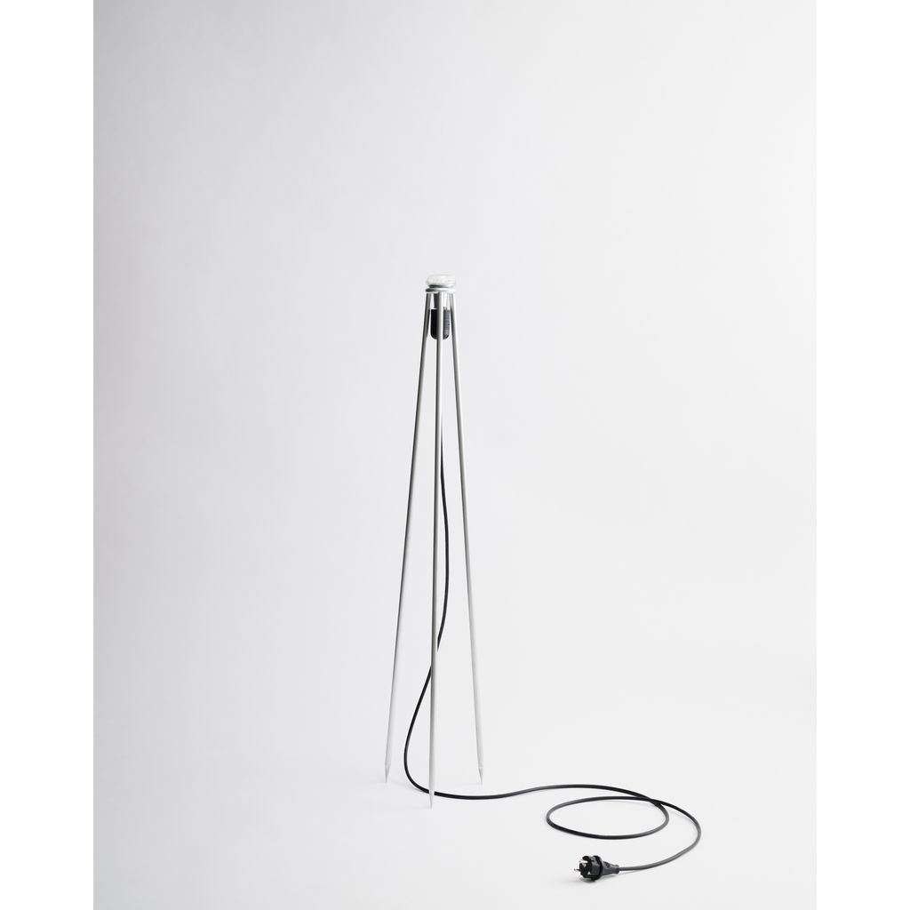The Trilight consists of cylindric shapes and extruded circles. A CNC-milled ring holds the smart LED bulb and connects the hand-milled legs at an angle to secure a safe stand. All legs have a pointy but slightly rounded end. The surfaces of each piece are carefully brushed by hand for an even finish.