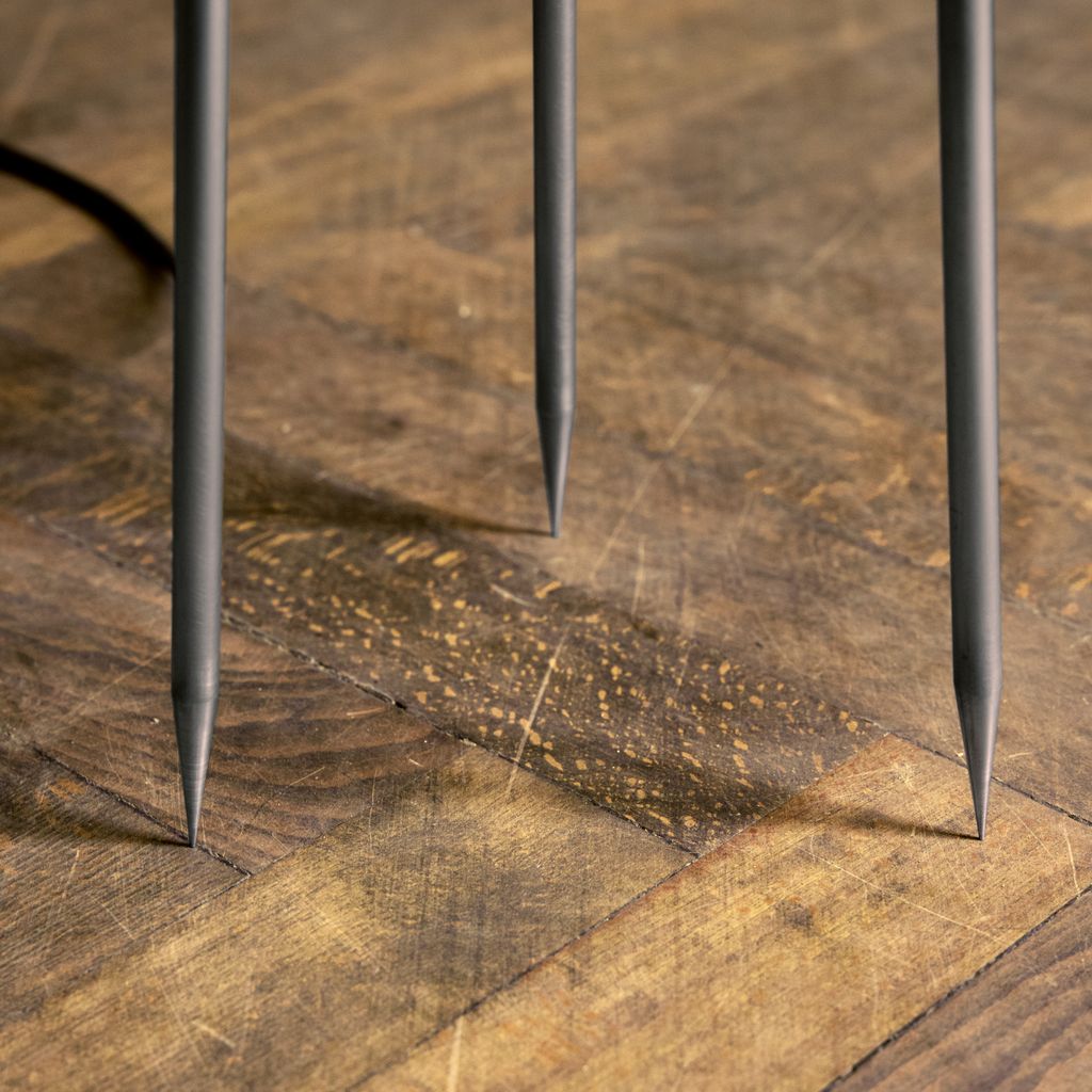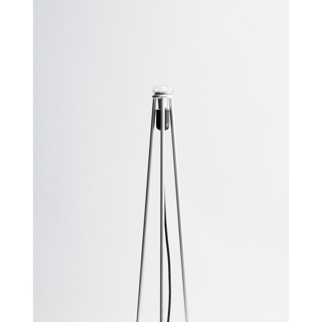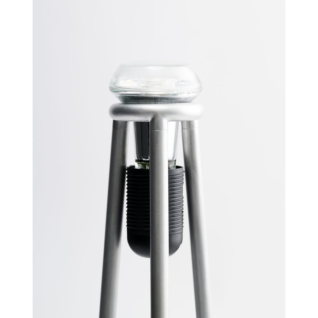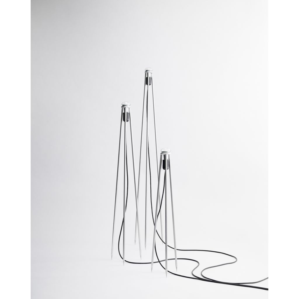 The Trilight consists of cylindric shapes and extruded circles. A CNC-milled ring holds the smart LED bulb and connects the hand-milled legs at an angle to secure a safe stand. All legs have a pointy but slightly rounded end. The surfaces of each piece are carefully brushed by hand for an even finish.